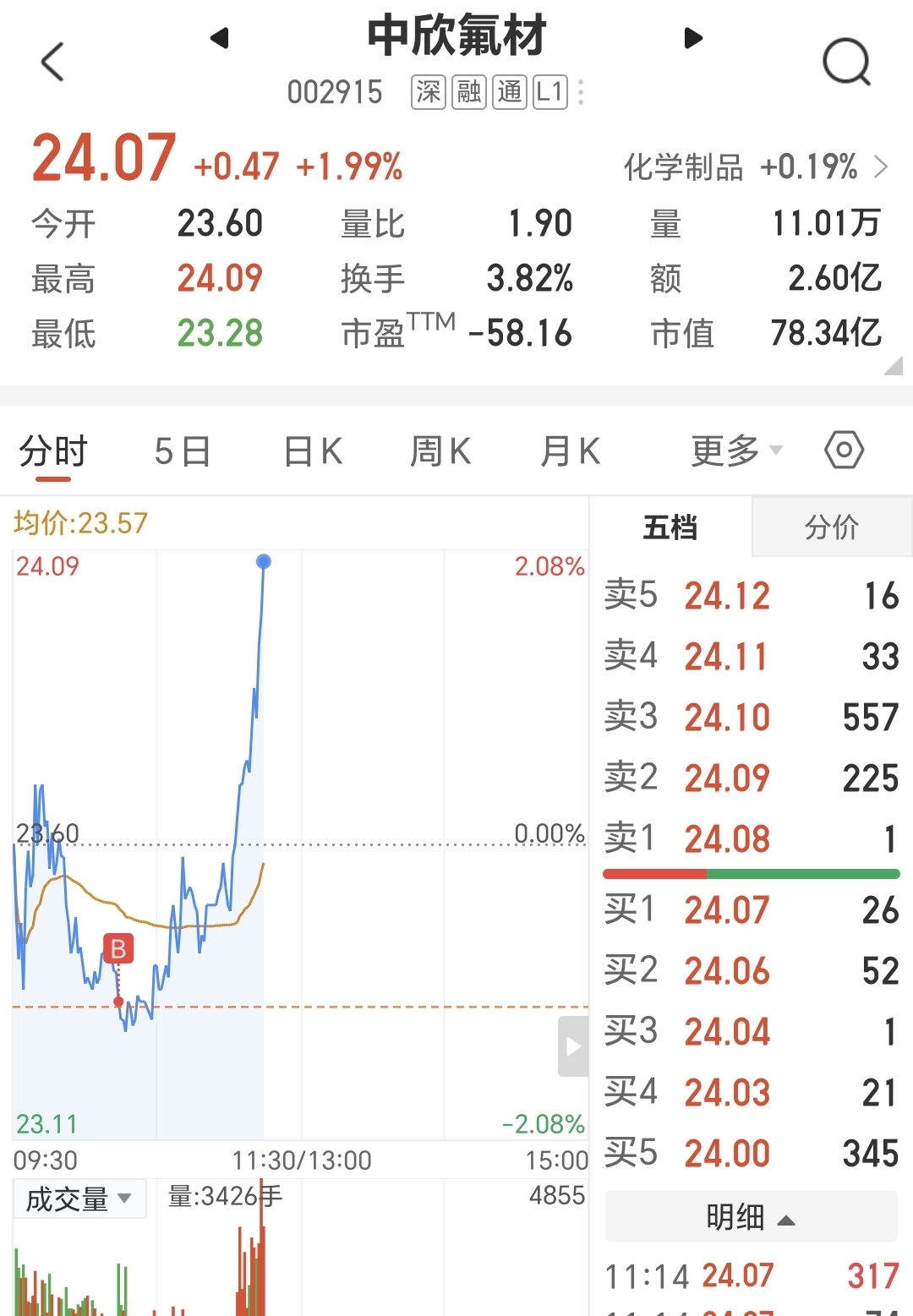 $中欣氟材(SZ002915)$ 23.29接了点,三天内必有惊喜