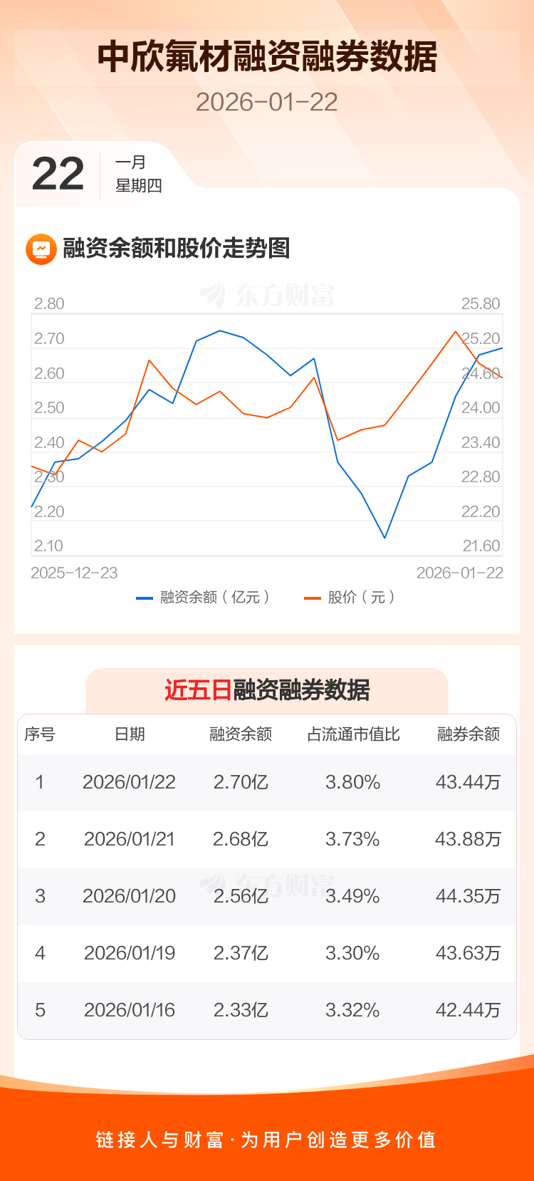 交易所最新数据显示,中欣氟材于2026年1月22日获融资买入2756.45万元,融资偿还2540.48万元,当日融资净买入215.96万元。目前,该股融资余额2.70亿,占流通市值比例为3.80%。