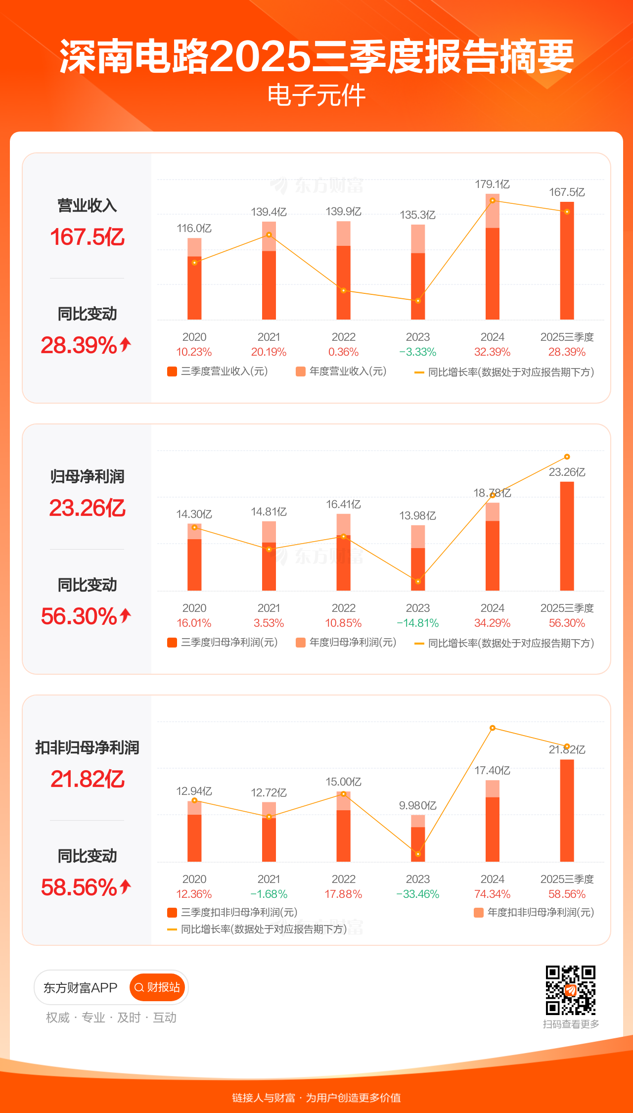 深南电路10月30日发布2025年三季报显示,公司前三季实现营业收入167.54亿元,同比增长28.39%;归母净利润23.26亿元,同比增长56.30%;扣非归母净利润21.82亿元,同比增长58.56%。