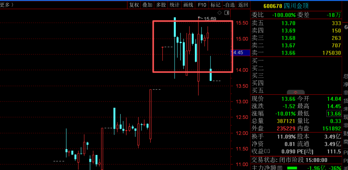 什么是缠论的三M位置,某级别中枢形成后,走势向上离开中枢,随后回调不重新进入中枢区间的低点,是确认中枢突破有效性的信号,属于 “趋势延续” M点。今天金顶的走势结构显然是不符合缠论三M的位置,昨天还是走小级别的中枢,今天并没有选择向上强势突破,开盘趋势运行的姿态就向下走弱,既然走势没有缠论的M点,那就不能去弄他了,早盘就删除自选股了。