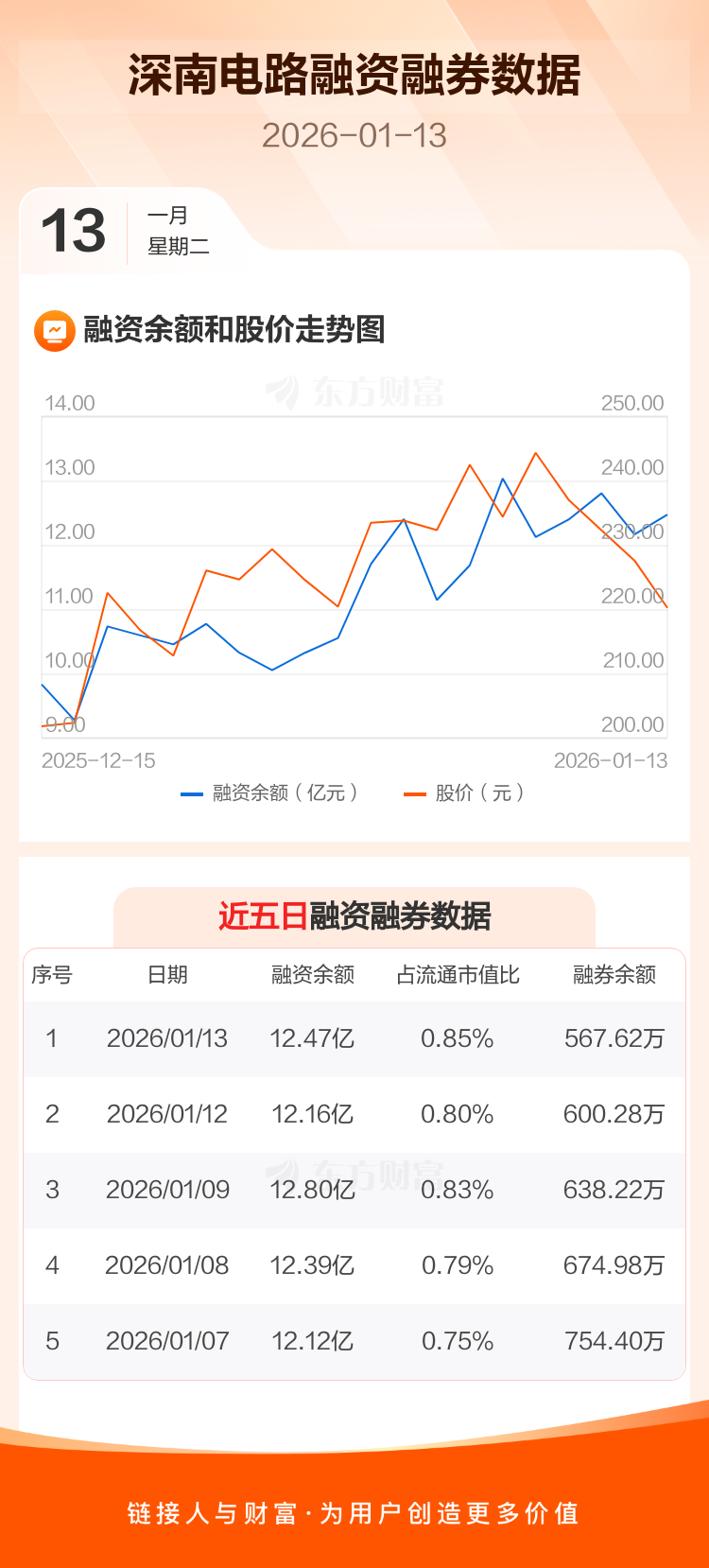 交易所最新数据显示,深南电路于2026年1月13日获融资买入1.76亿元,融资偿还1.44亿元,当日融资净买入3166.28万元。目前,该股融资余额12.47亿,占流通市值比例为0.85%。