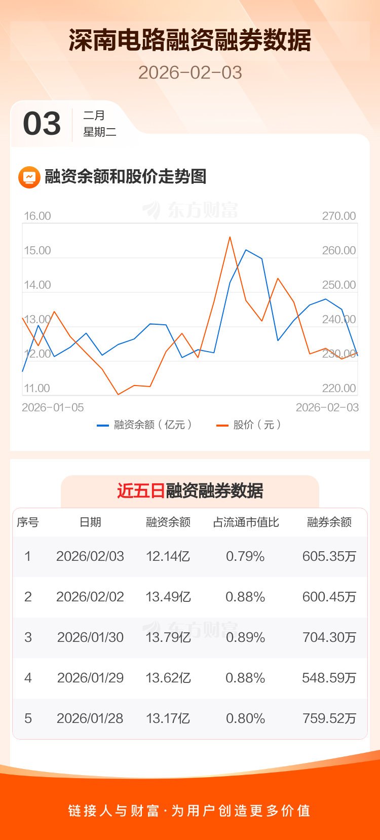交易所最新数据显示,深南电路于2026年2月3日获融资买入1.05亿元,融资偿还2.39亿元,当日融资净偿还1.35亿元。目前,该股融资余额12.14亿,占流通市值比例为0.79%。