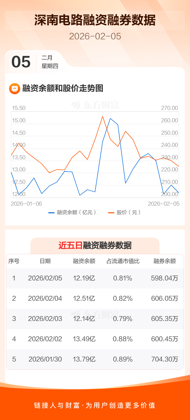 交易所最新数据显示,深南电路于2026年2月5日获融资买入5407.16万元,融资偿还8600.06万元,当日融资净偿还3192.9万元。目前,该股融资余额12.19亿,占流通市值比例为0.81%。