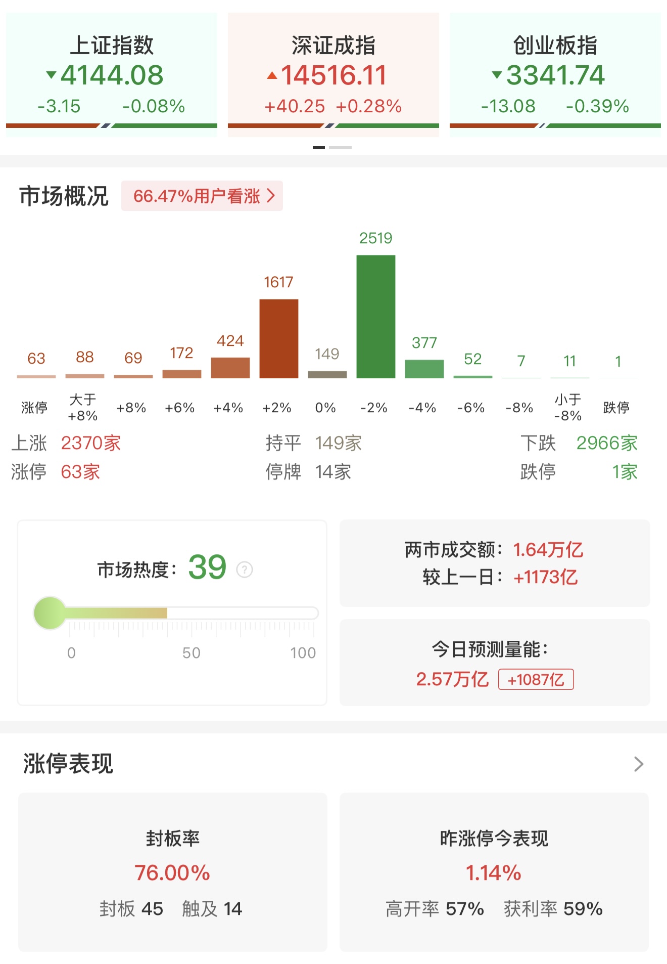 财联社2月26日电,早盘三大指数涨跌不一,深成指探底回升翻红,创业板指走势稍弱,黄白线明显分化。沪深两市半日成交额1.64万亿,较上个交易日放量1173亿。盘面上热点快速轮动,全市场超2900只个股下跌。从板块来看,算力硬件股持续活跃,PCB、CPO、液冷服务器概念均表现强势,深南电路、大族激光、沪电股份、广合科技、川润股份涨停。电力板块走强,赣能股份2连板,华银电力涨停。燃气轮机概念集体拉升,东方电气、常宝股份封涨停。小金属概念表现活跃,云南锗业2连板,章源钨业触及涨停。下跌方面,锂电池板块盘中震荡回落,鹏辉能源跌超9%。影视院线再度下挫,博纳影业大跌。截至收盘,沪指跌0.08%,深成指涨0.28%,创业板指跌0.39%。