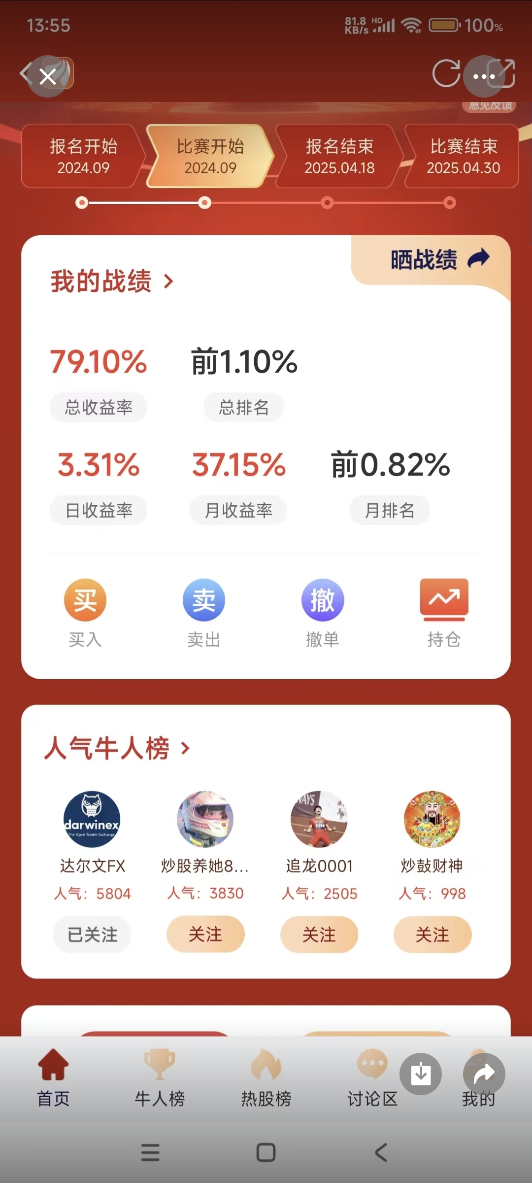 $金奥博(SZ002917)$ 我自己参加比赛刚刚开始还是东财全国炒股比赛第前100。后来比了几个月一直在前一左右徘徊。连续几个月每天看股票十个小时实在受不了,不比了!