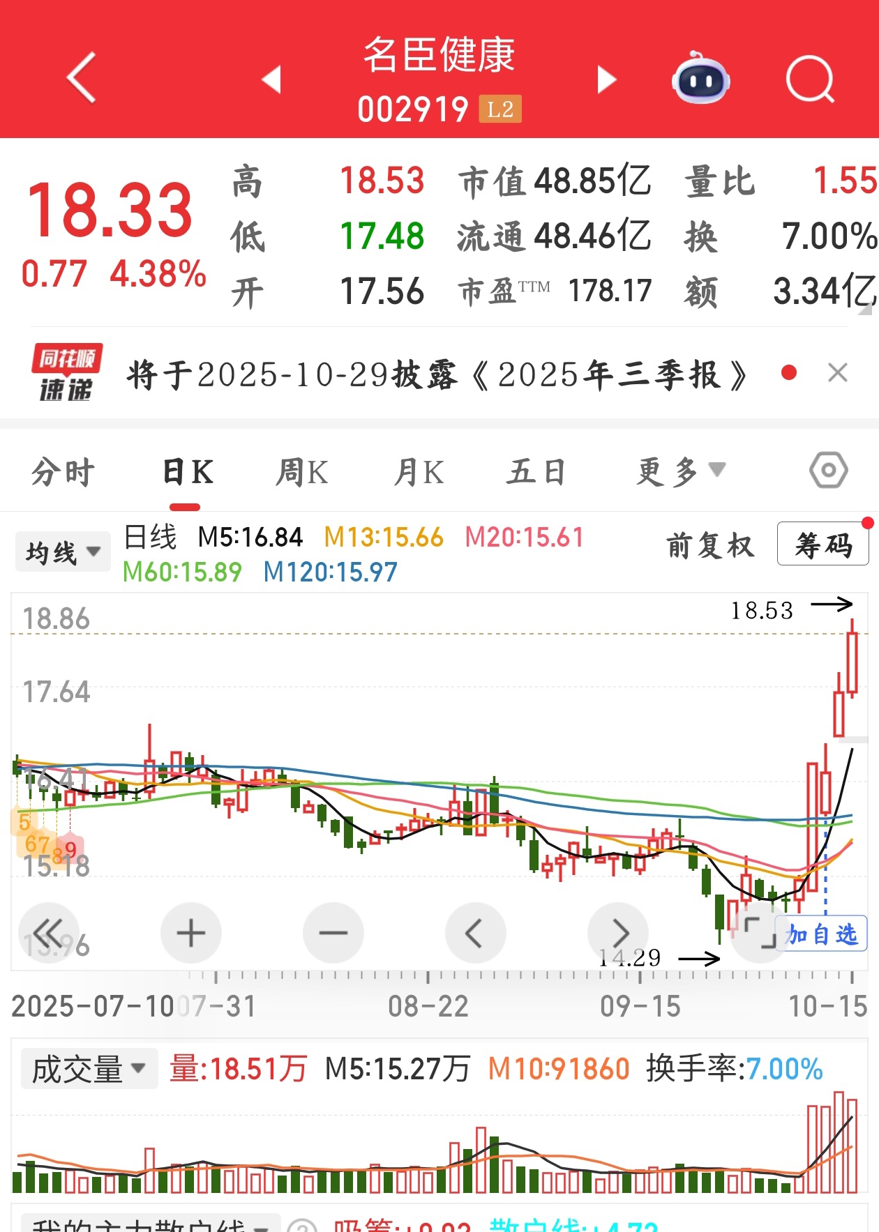 $名臣健康(SZ002919)$ 继续堆量任何回调都是买点