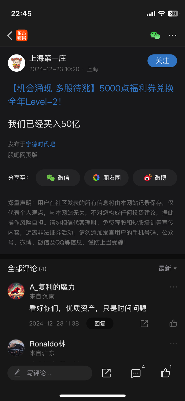 温馨提示: 1.根据《证券法》规定,禁止编造、传播虚假信息或者误导性信息,扰乱证券市场;2.用户在本社区发表的所有资料、言论等仅代表个人观点,与本网站立场无关,不对您构成任何投资建议。用户应基于自己的独立判断,自行决定证券投资并承担相应风险。《东方财富社区管理规定》