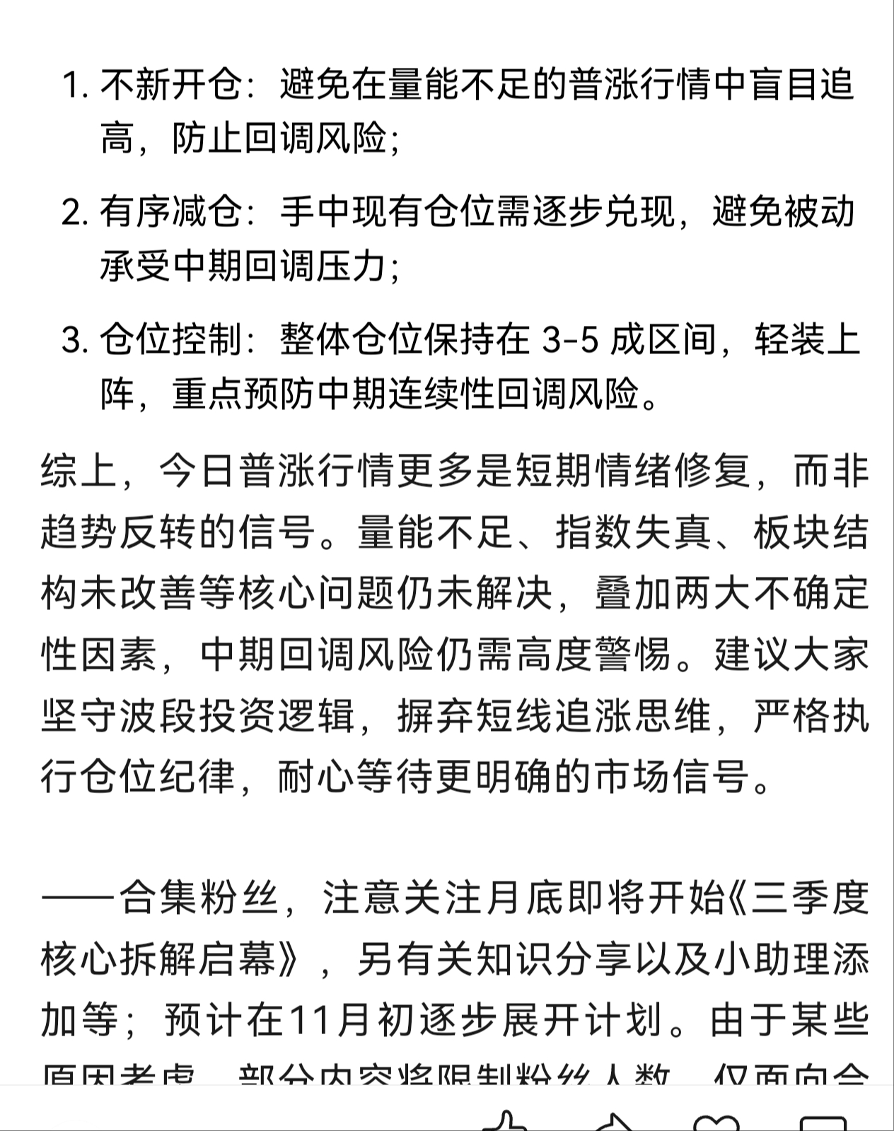 庄粉们,你们庄哥前几天说仓位控制到7成仓,这又让把仓位减到3到5成仓位,看来这股