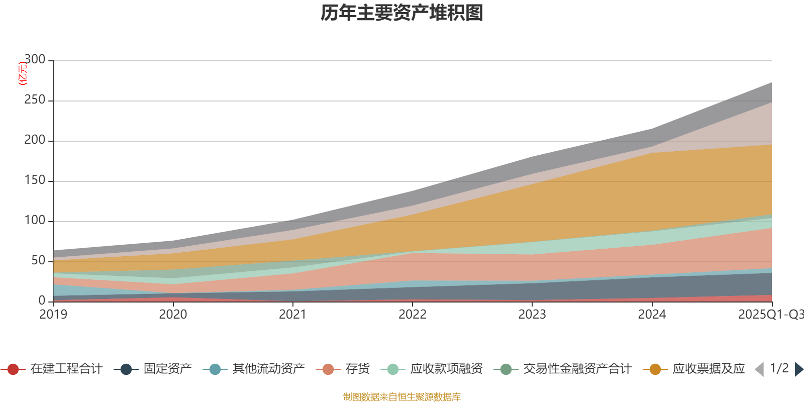 资产重大变化方面,截至2025年三季度末,公司货币资金较上年末增加577.05%,占公司总资产比重上升15.66个百分点;应收票据及应收账款较上年末减少10.24%,占公司总资产比重下降13.15个百分点;应收款项融资较上年末减少26.48%,占公司总资产比重下降3.29个百分点;固定资产较上年末增加6.77%,占公司总资产比重下降1.88个百分点。