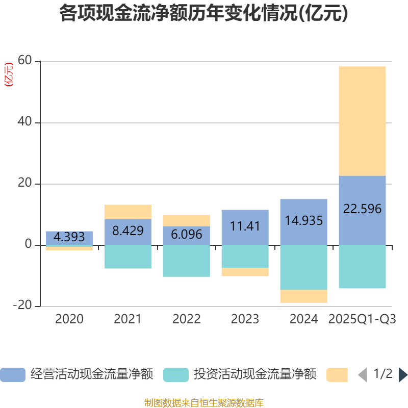 2025年前三季度,公司经营活动现金流净额为22.6亿元,同比增长169.3%;筹资活动现金流净额35.72亿元,同比增加39.65亿元;投资活动现金流净额-14.18亿元,上年同期为-10.02亿元。
