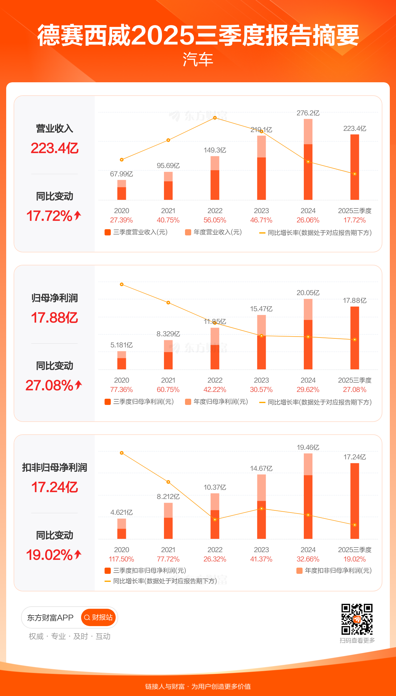 德赛西威10月28日发布2025年三季报显示,公司前三季实现营业收入223.37亿元,同比增长17.72%;归母净利润17.88亿元,同比增长27.08%;扣非归母净利润17.24亿元,同比增长19.02%。