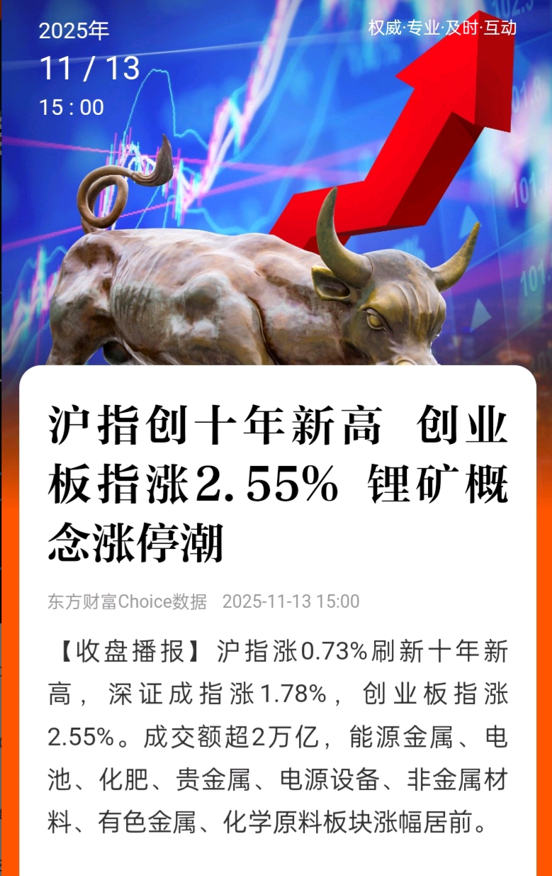 沪指创十年新高创业板指涨2.55%锂矿概念涨停潮。
