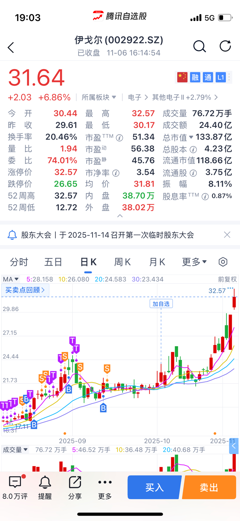 $伊戈尔(SZ002922)$ 不动的话就翻倍了,错过了,