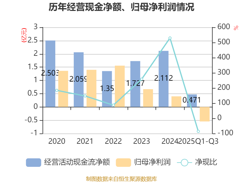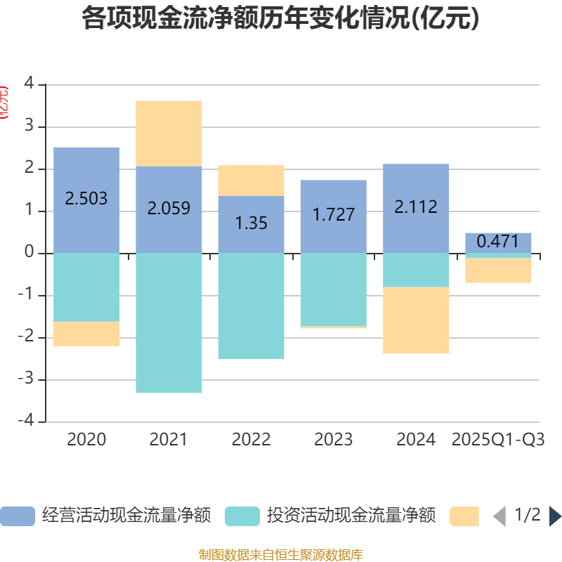2025年前三季度,公司经营活动现金流净额为4705.73万元,同比下降71.89%;筹资活动现金流净额-5858万元,同比增加7427万元;投资活动现金流净额-1247.09万元,上年同期为-7334.44万元。