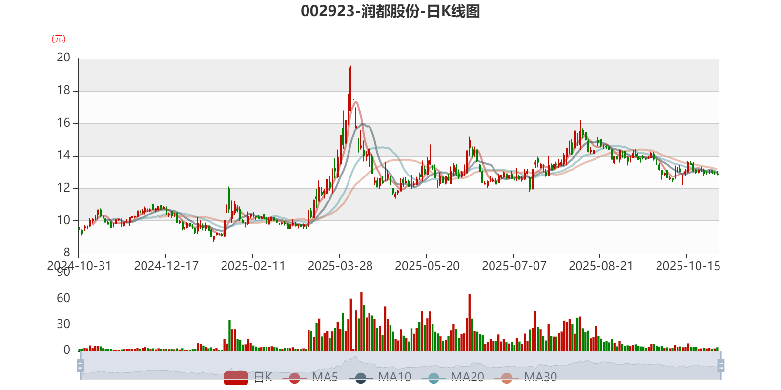 中证智能财讯润都股份(002923)10月31日披露2025年第三季度报告。前三季度公司实现营业总收入8.84亿元,同比增长0.85%;归母净利润亏损5468.78万元,上年同期盈利3718.05万元;扣非净利润亏损6612.63万元,上年同期盈利2612.12万元;经营活动产生的现金流量净额为4705.73万元,同比下降71.89%;报告期内,润都股份基本每股收益为-0.16元,加权平均净资产收益率为-4.96%。