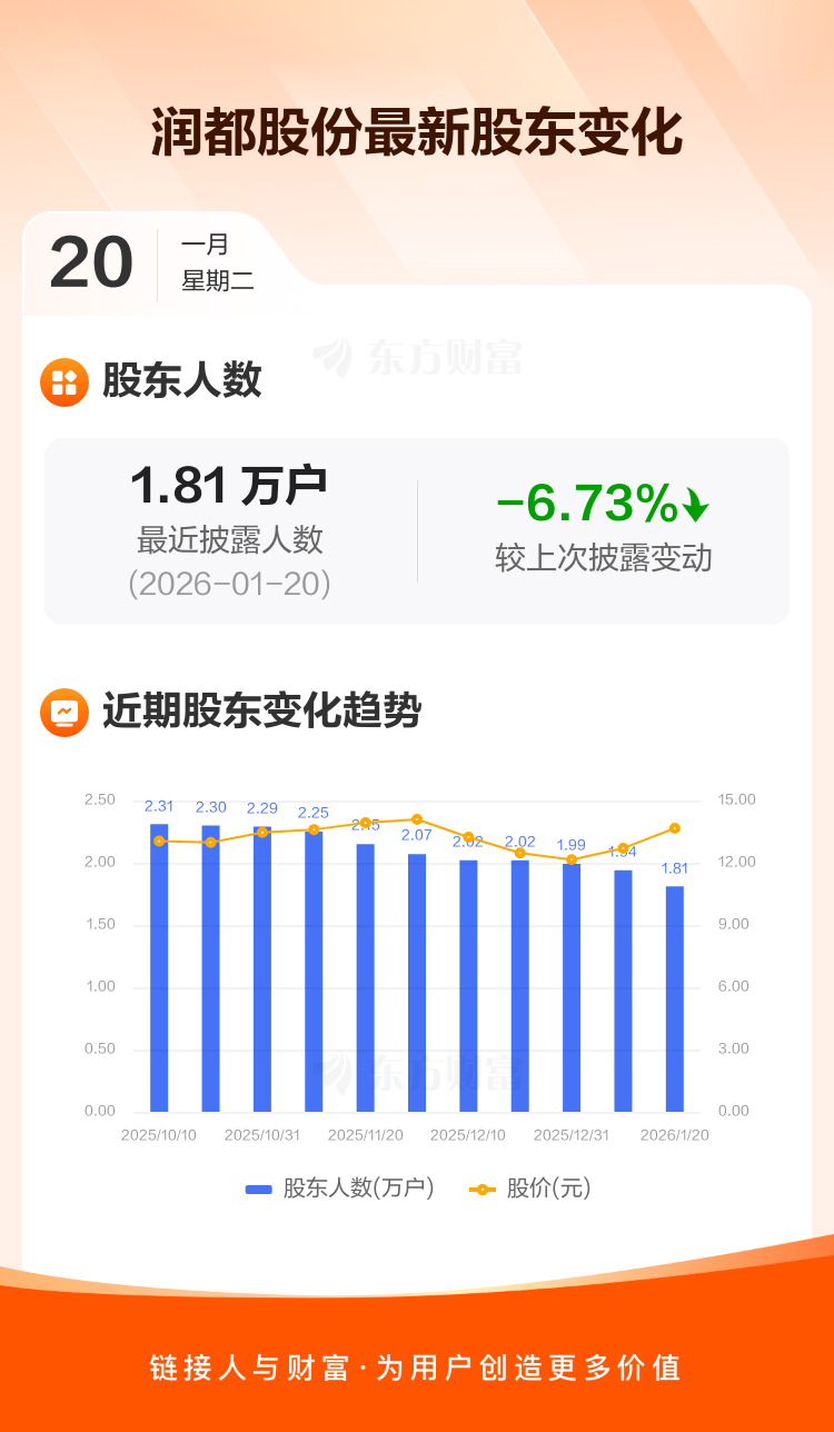 润都股份最新披露数据显示,截至1月20日公司股东户数为1.81万户,较上期(2026年1月9日)减少1309户,降幅为6.73%。户均持有流通股数量由上期的1.33万股上升至1.42万股,户均持股金额由上期的16.86万元增加至19.45万元。