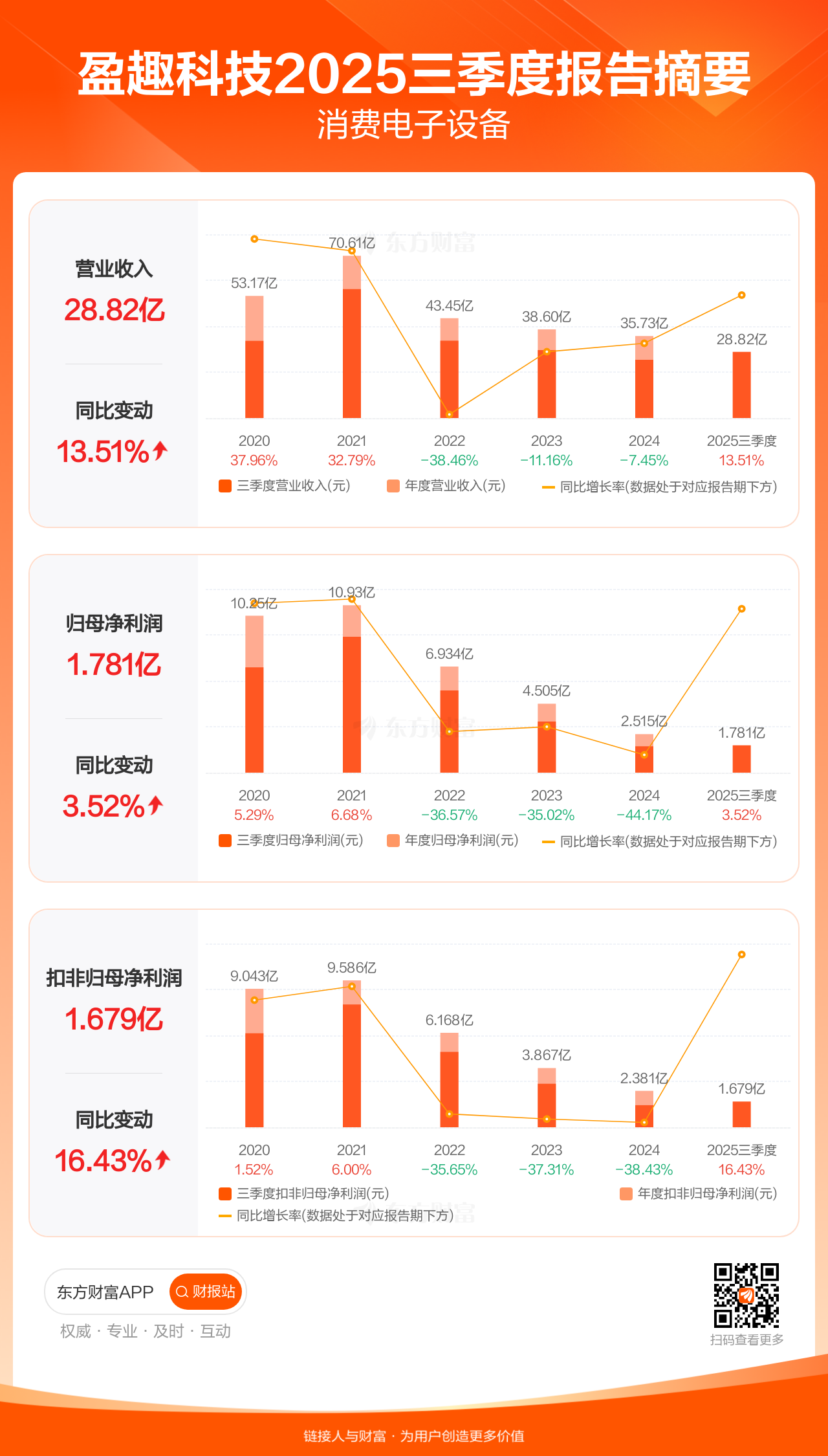 盈趣科技10月31日发布2025年三季报显示,公司前三季实现营业收入28.82亿元,同比增长13.51%;归母净利润1.78亿元,同比增长3.52%;扣非归母净利润1.68亿元,同比增长16.43%。