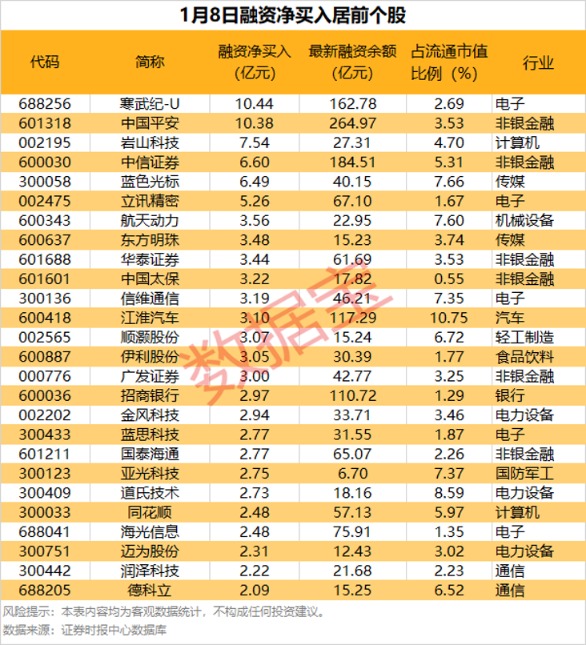 具体到个股,1月8日获融资净买入1亿元以上的有74股,其中,6股融资净买入额均超5亿元。