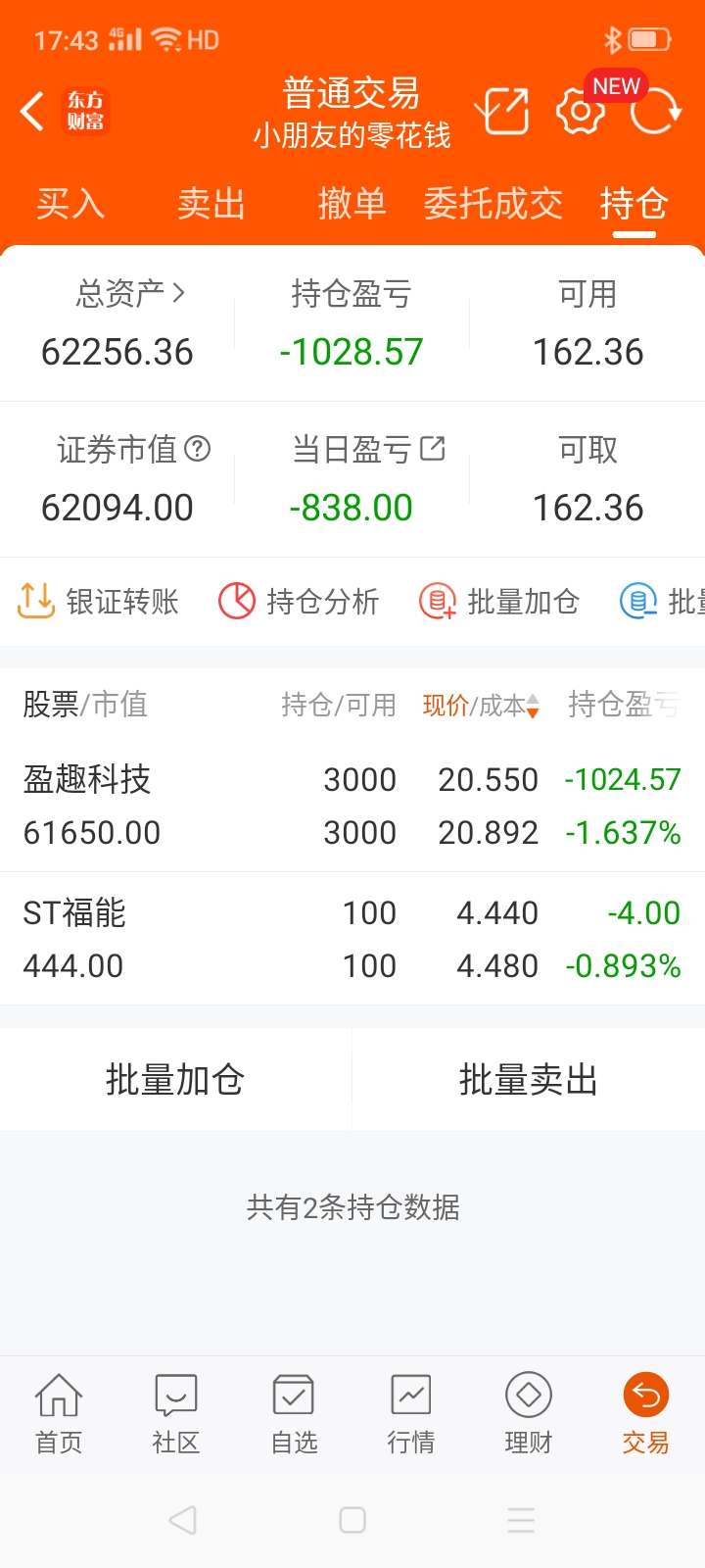 13号加了1000股,最高浮盈5千多。14-15随大盘回调,未操作,浮亏-1024.57,继续坚定持有。