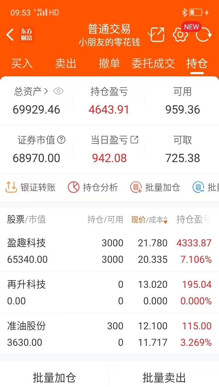 一点点余额 昨天开板进的 再升科技,早盘挂涨停单撤了6个点卖了,换了 准油股份。盈趣科技需要发力了,前面的平台磨了好久,卒子过河慢慢拱。