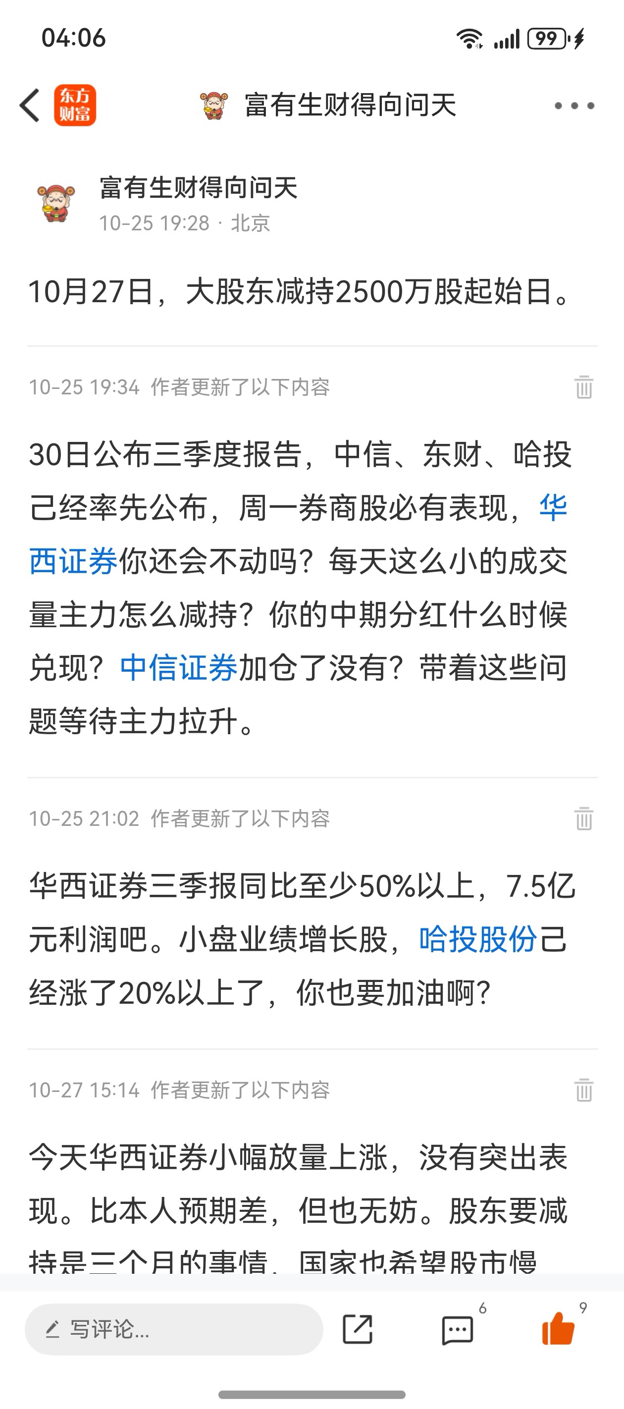 明牌了,华西证券第三季度不负投资者众望,利润高达10.56亿元,同比增315%,环比155%。昨天出季度报告的东北证券等,因利润增幅超预期今天冲击涨停。那么华西证券明天如何表现?个人预判将高开5个点以上,或者直接冲击涨停。即使近期不涨停,后市也会持续上涨。大股东减持需要股价上涨,公司持续的高增长也为股票上涨提供了基础。持有,一路持有。
