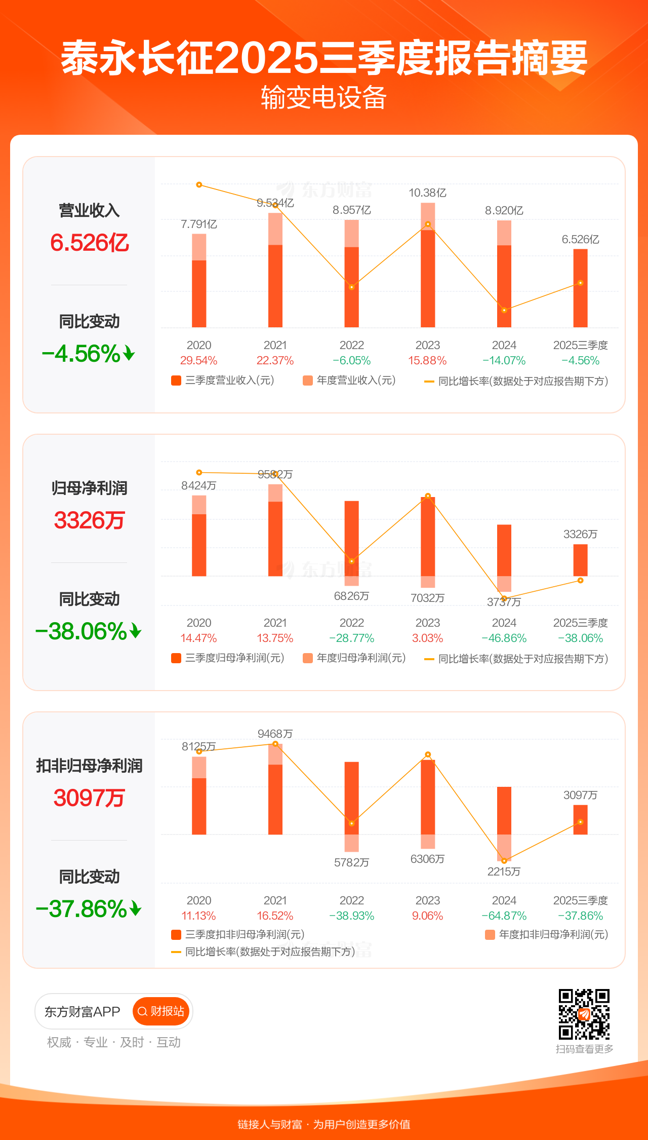 图解财报:泰永长征前三季归母净利润3325.94万元,同比减少38.06%