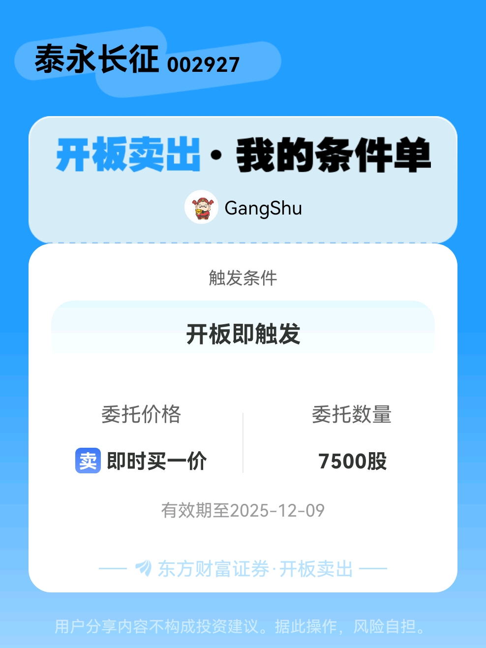 #条件单交流# #开板卖出晒单# 一位股神设置了一个开板卖出条件单,接下来就是见证奇迹的时刻~$泰永长征(SZ002927)$