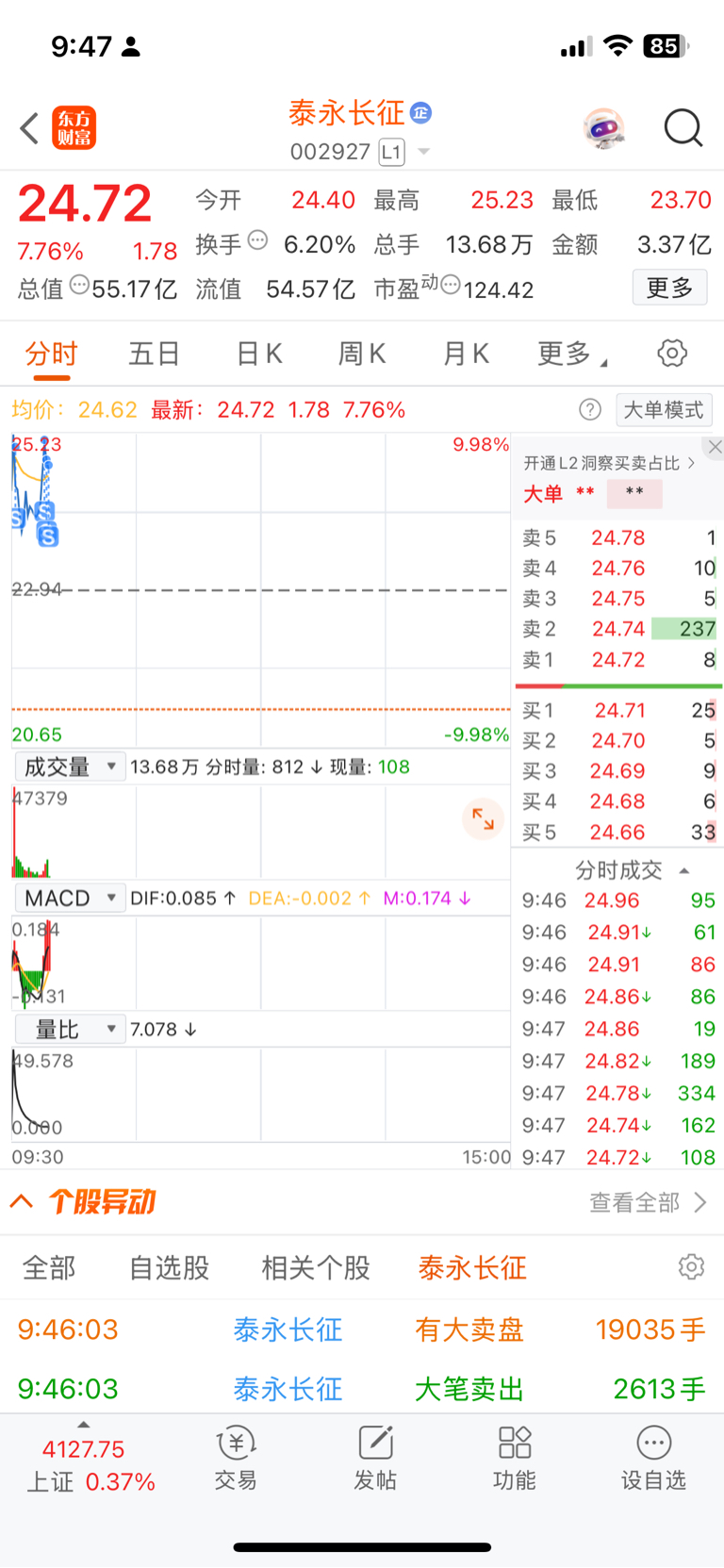 $泰永长征(SZ002927)$ 你们加仓的加吧 我买了三天 今天跑了