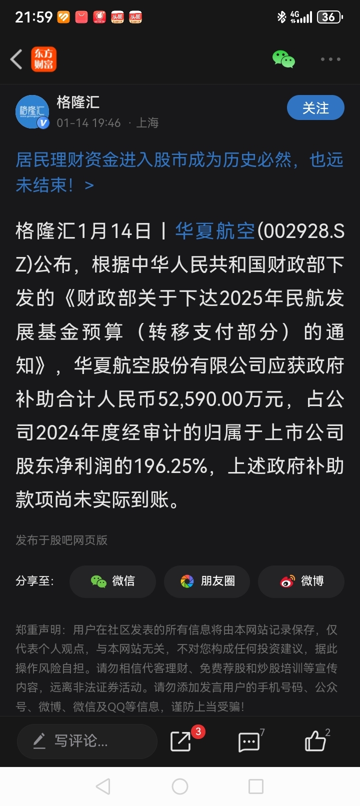 真有点弄清楚,这预喜利润中包不包括支线航空的政府补贴?预喜利润5一7亿,是否含有