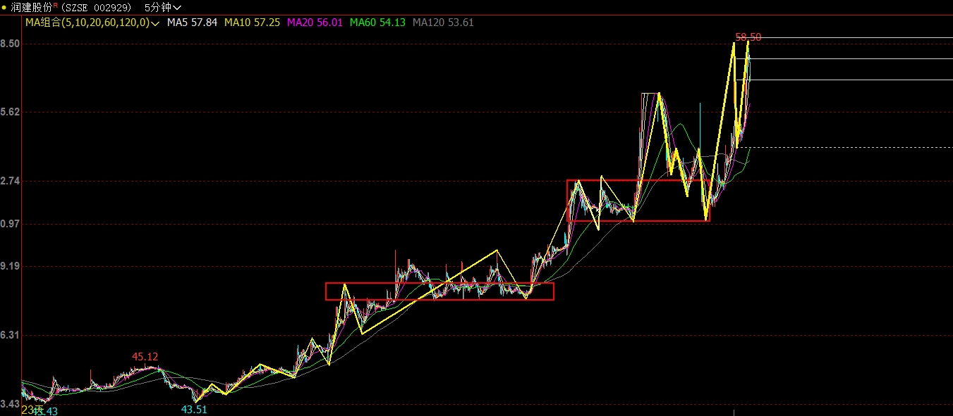 5分钟的这个中枢给出了二买,回踩0.618都没有碰到..对应的目标点位1.382-1.618的价位是56.48-57.98,这是底部强势图形,而且速度会很快..果然偷懒就会踏空..昨天出来的仓位应该直接尾盘追进来的。