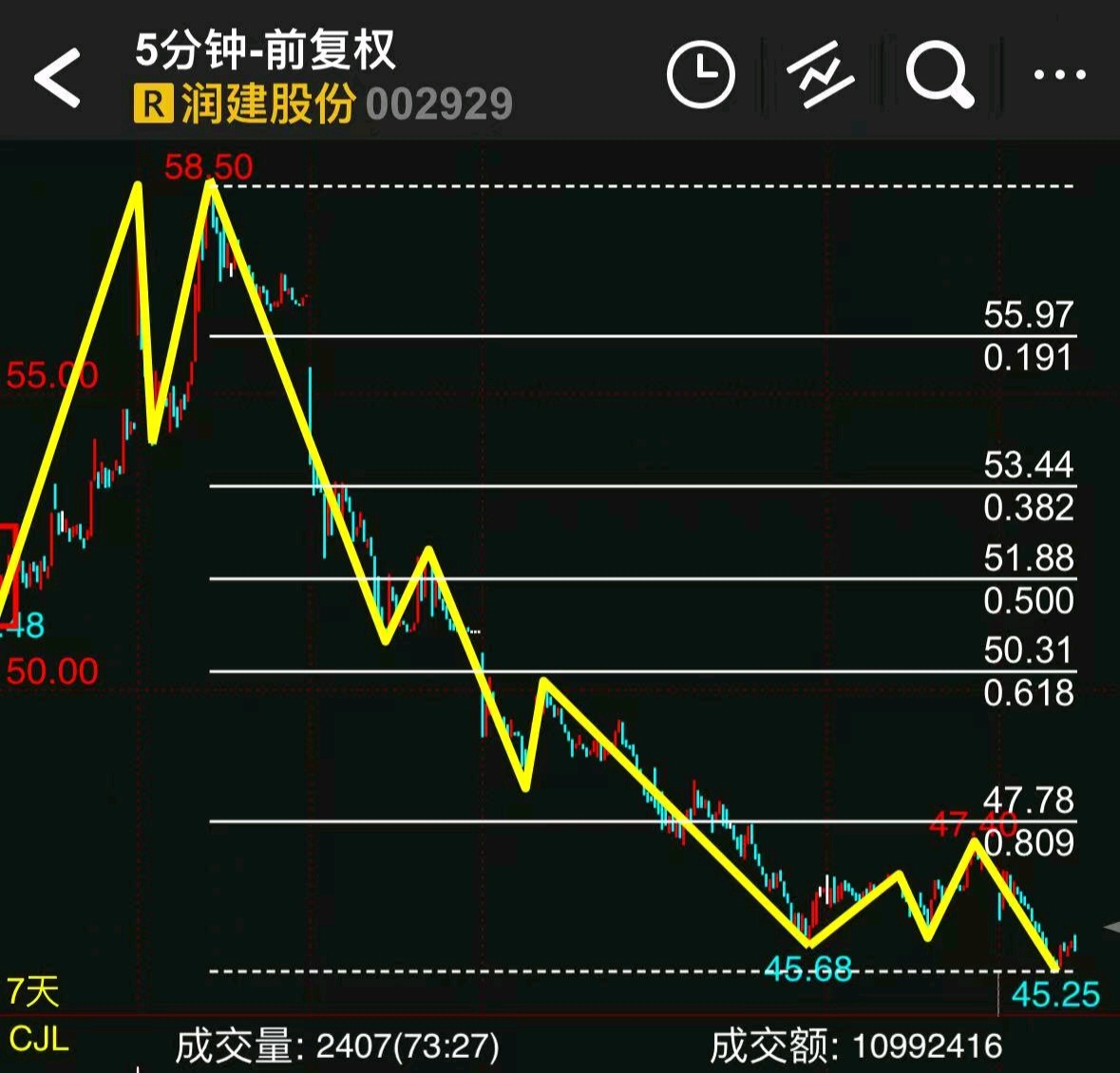 今天手里绿了两支票,一支润建一支成飞,别人都开始晒单了,只有我在陌陌画图..今天润建又一次回踩支撑位,空间上来说明天将会是变盘节点,主观上44.8以下已经成为历史,这个位置必不会破,目前小级别高点越来越低,低点越来越高,走势符合主力震荡吸筹,48-51筹码越来越集中,拉升只是时间问题