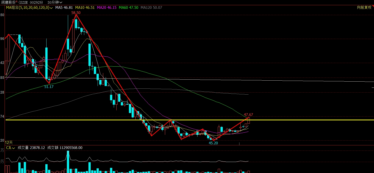润建30分钟突破了,这里是反弹,不是反转,这波反弹点位先看到50,前面说了50是多空分水岭,看50能不能放量突破了