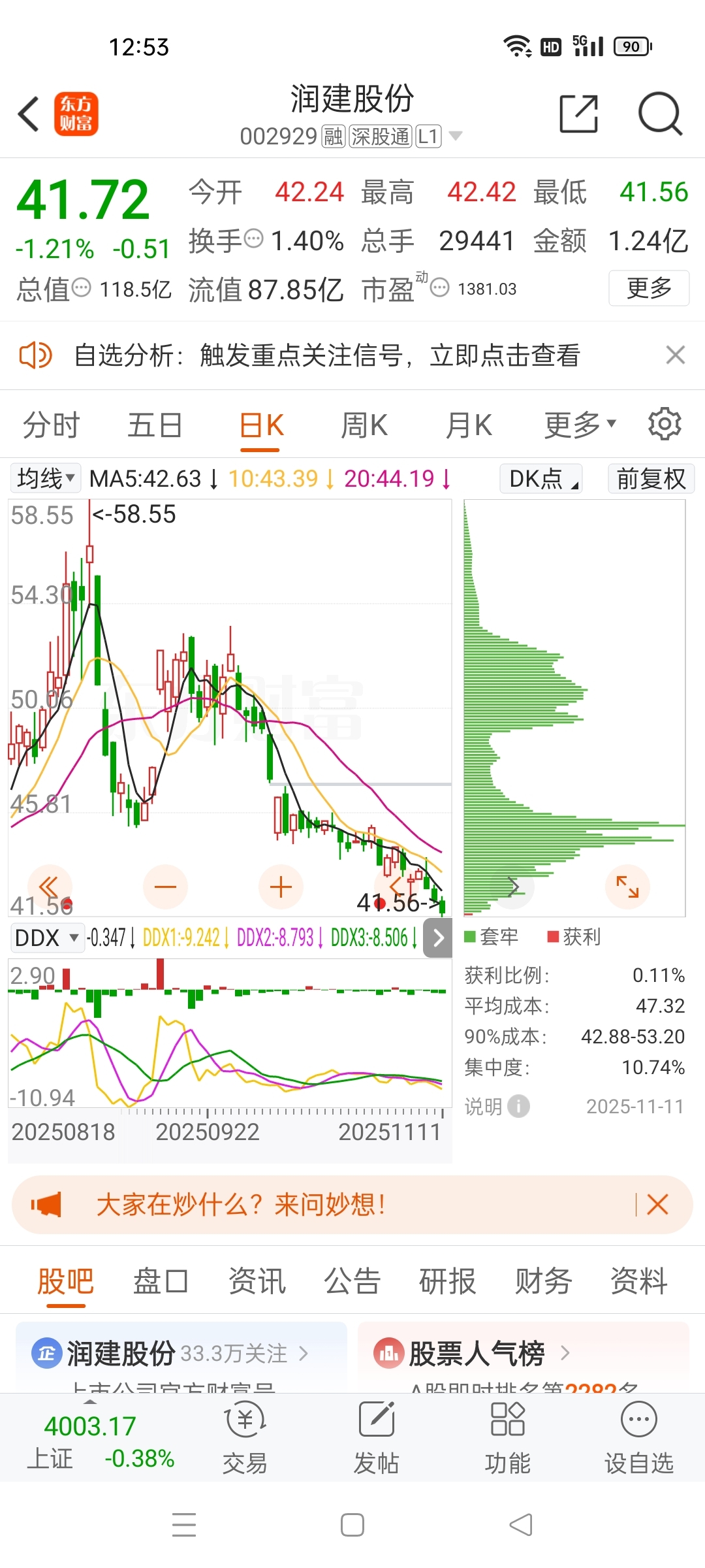 $润建股份(SZ002929)$ 真的遇到恶庄了,50多进的,当时买100股都亏一千多,我的天啊,一直犹豫要不要补仓,天天新低。这个现在没一个是挣钱的,获利盘0.11%了