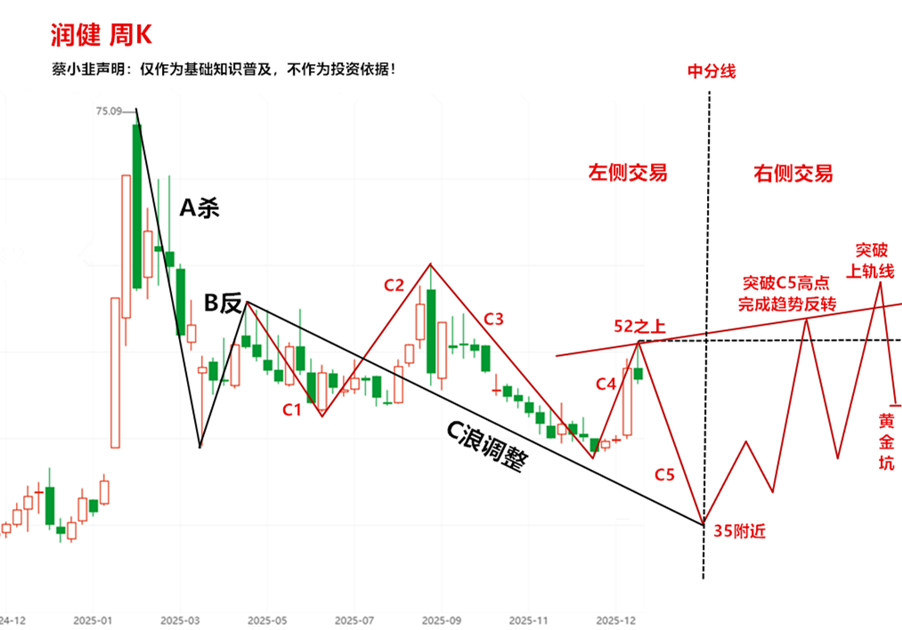 6、一半来说,C5向下调整,见新低就是底部,很可能35附近磨底。结束调整之后,这里就是中分线,左侧就是下降通道,也称为左侧交易;未来的右侧,就是上升通道,也称为右侧交易。