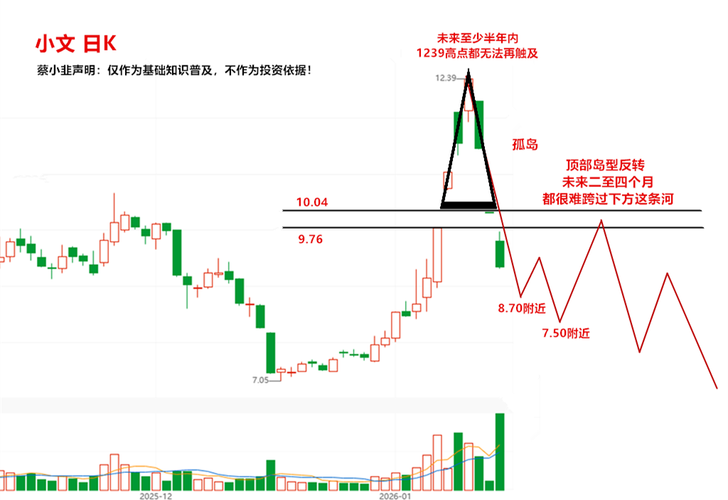 一、元月19号,今天小文在976附近没有承接,在904至930区间放出巨量,976至1004区间,形成了一条左右贯穿的小河,“顶部岛形反转”成立,小文进入派发期!未来至少半年内,小文都会是震荡向下,1239都会是一个遥不可及的高点!