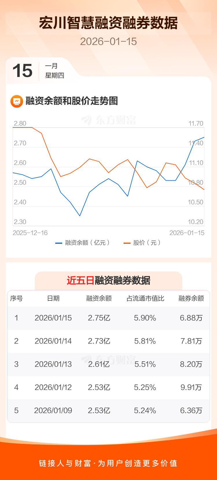 交易所最新数据显示,宏川智慧于2026年1月15日获融资买入1197.83万元,融资偿还1007.20万元,当日融资净买入190.64万元。目前,该股融资余额2.75亿,占流通市值比例为5.90%。