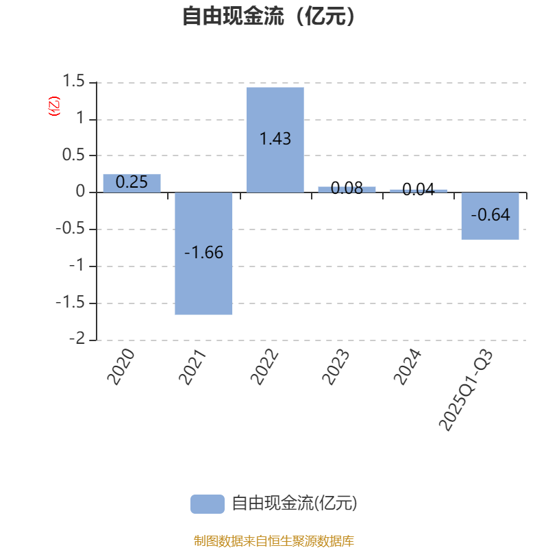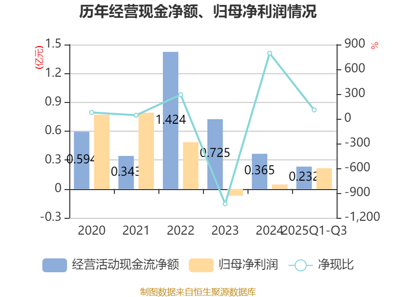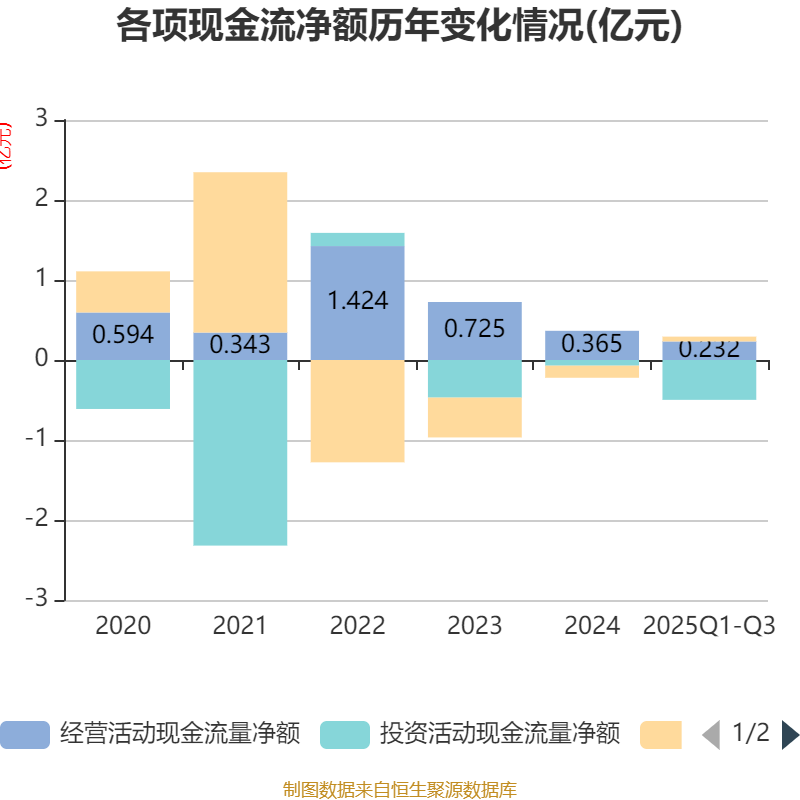 2025年前三季度,公司经营活动现金流净额为2322.44万元,同比增长89.35%;筹资活动现金流净额596.85万元,同比增加1471.55万元;投资活动现金流净额-4977.89万元,上年同期为-921.81万元。