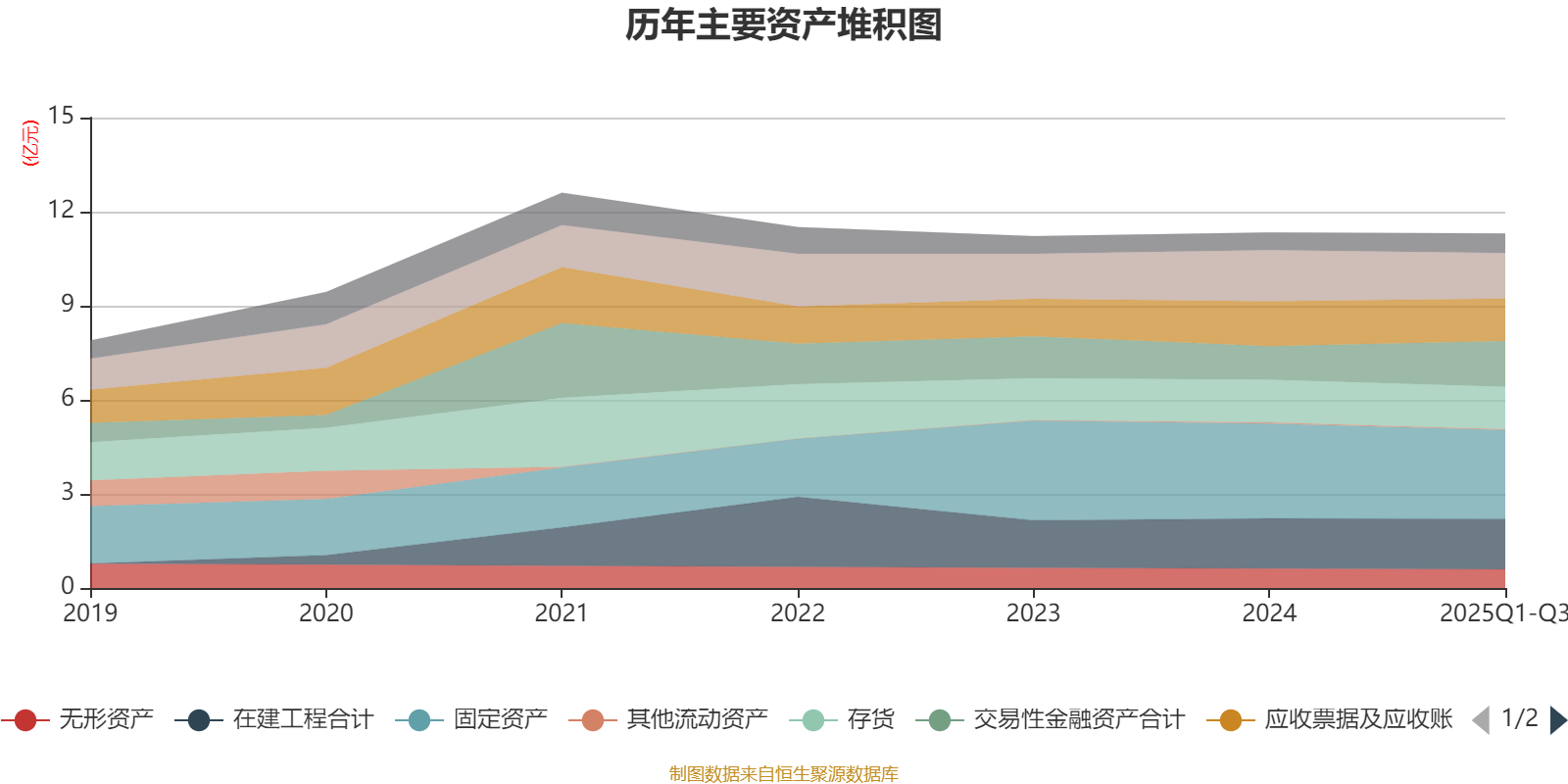 资产重大变化方面,截至2025年三季度末,公司交易性金融资产合计较上年末增加36.38%,占公司总资产比重上升3.47个百分点;固定资产较上年末减少6.28%,占公司总资产比重下降1.61个百分点;货币资金较上年末减少10.88%,占公司总资产比重下降1.53个百分点;应收票据及应收账款较上年末减少5.77%,占公司总资产比重下降0.7个百分点。