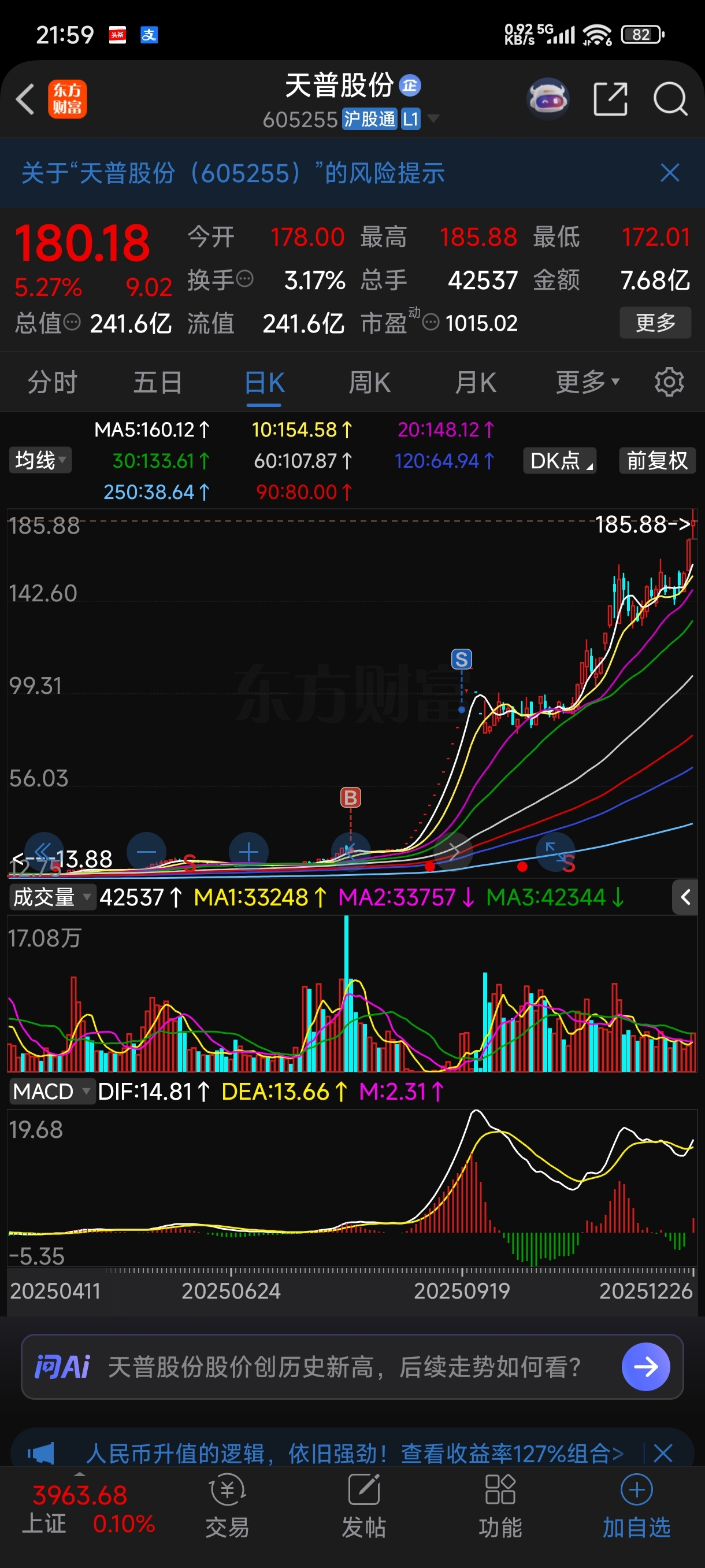你越骂它越涨,当初我拿的天普也一样,天天说跌停,吓得我在91块钱出来了,后来一直