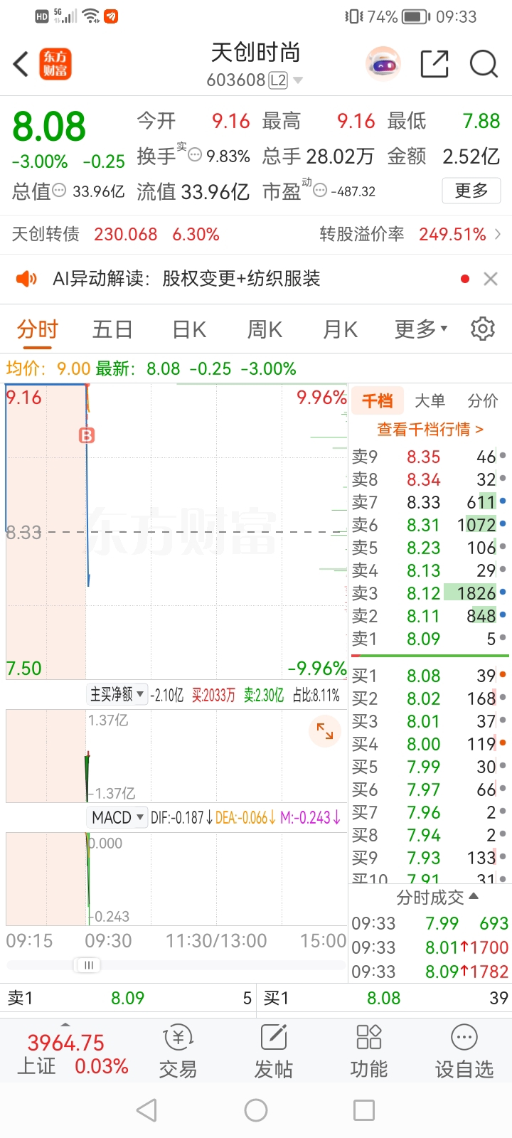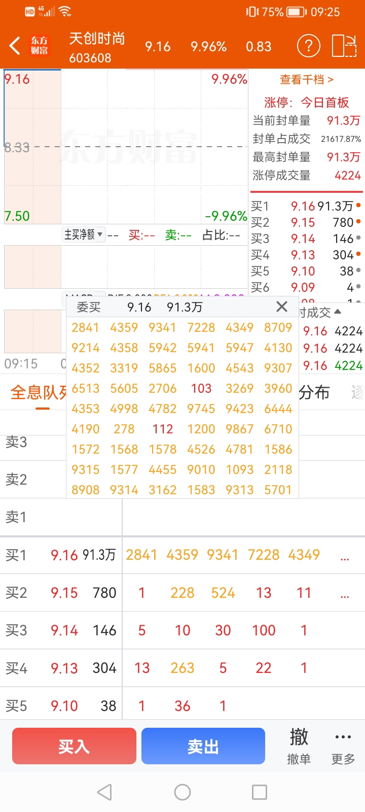 $锋龙股份(SZ002931)$ $天创时尚(SH603608)$ 打板客无语死了,开盘91.3万手都封不住涨停板!庄家第一个板就出货?学习一下隔壁锋龙股份多顶几个一字涨停再出货不好吗?这穷庄一辈子!