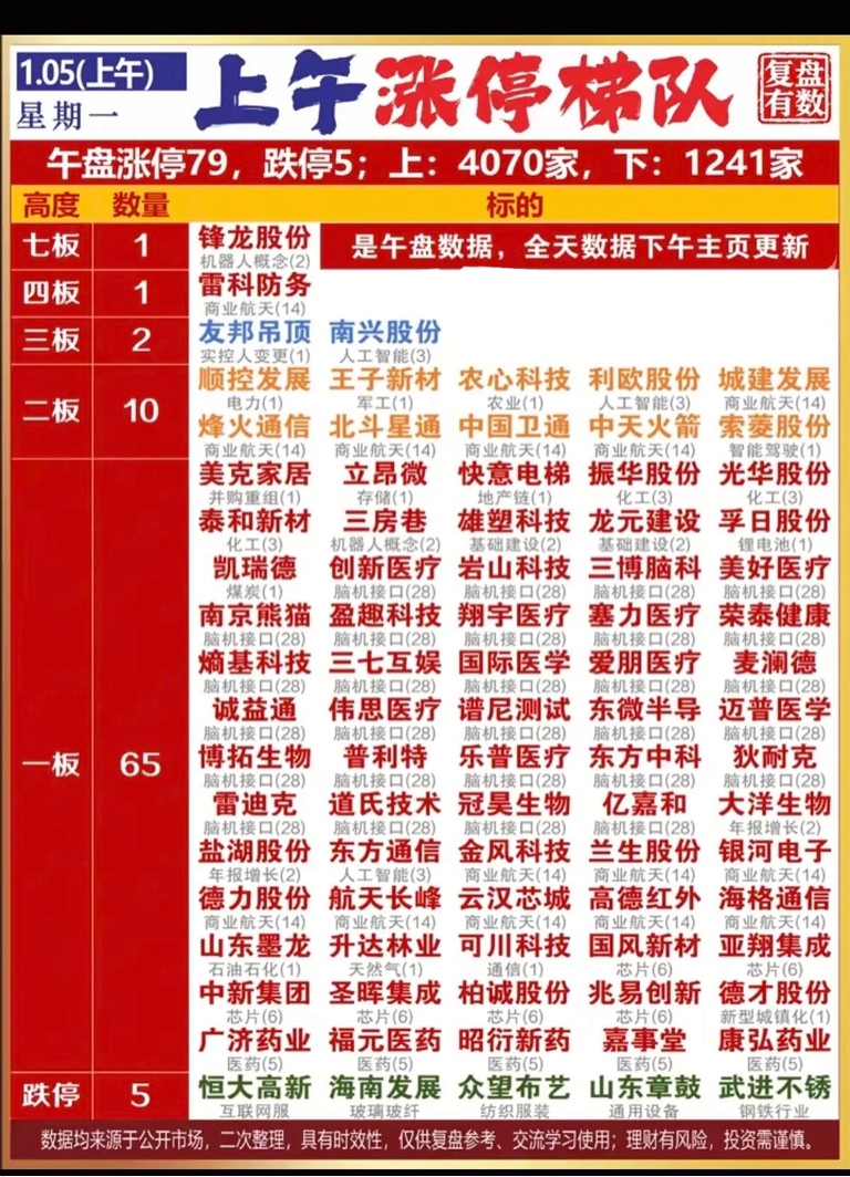 1月5日午盘数据显示,市场情绪全面高涨,涨停个股达79家,跌停仅5家,上涨家数超4000家。热点主线清晰,脑机接口、商业航天、机器人、芯片四大科技赛道成为资金主攻方向,其中脑机接口标的数量最多,商业航天与机器人概念则以多股连板的形式展现板块强度。市场连板梯队完整,从七板高标到首板补涨形成有效接力,赚钱效应集中在科技成长领域。