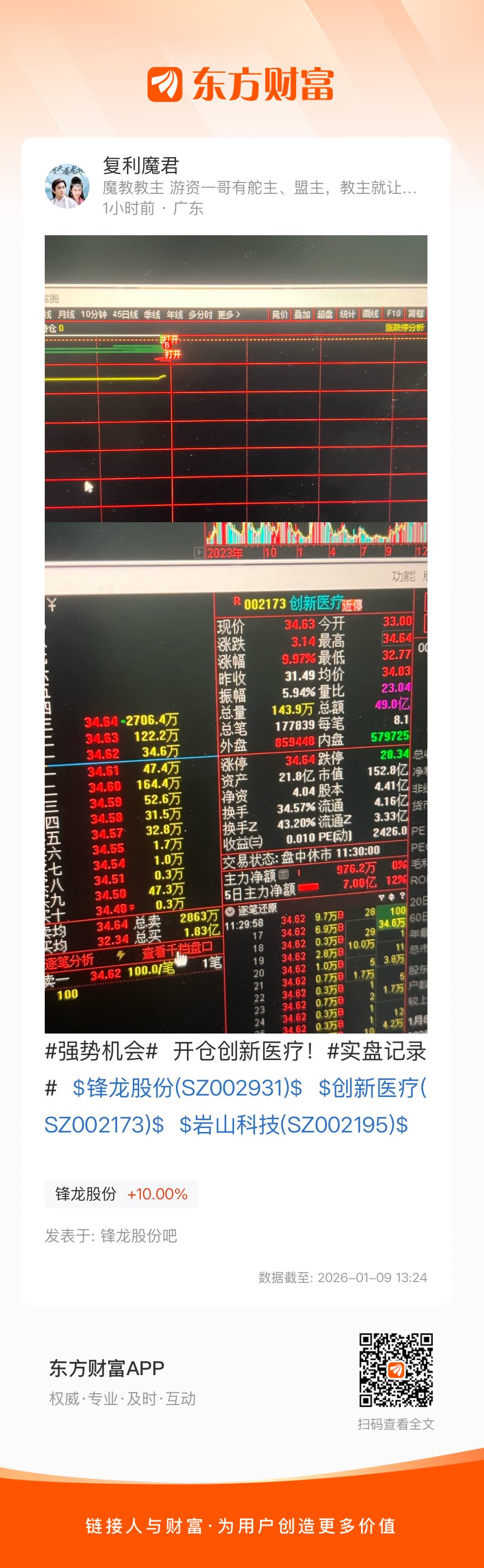 #强势机会# 开仓创新医疗!#实盘记录# $锋龙股份(SZ002931)$ $创新医疗(SZ002173)$ $岩山科技(SZ002195)$