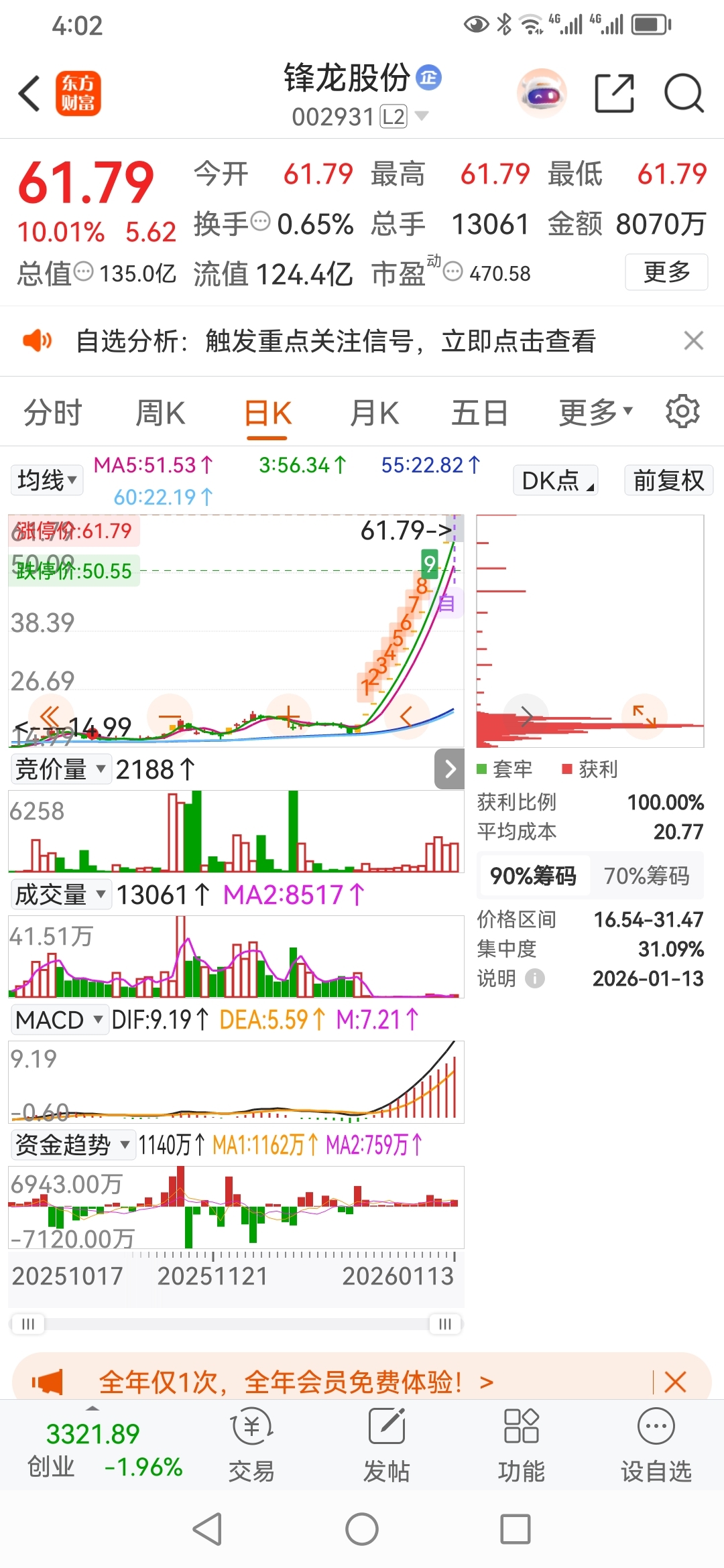 军哥股票,锋龙股份。集合竞价,成交量,资金,macd。