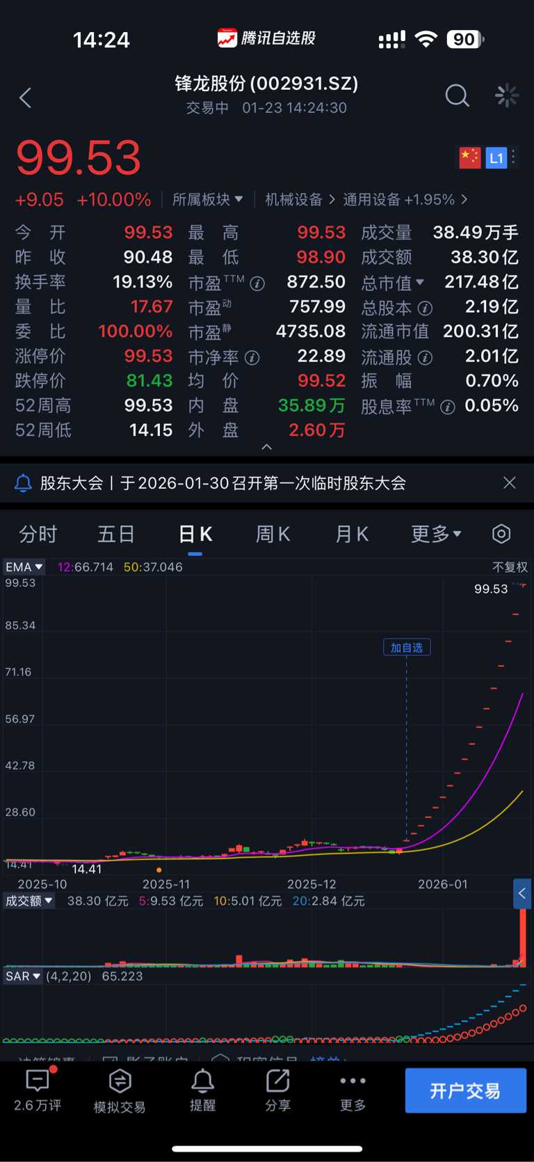 $锋龙股份(SZ002931)$ 复牌的那几天,天天打板没打进来,遗憾那我勒个去,翻了五倍