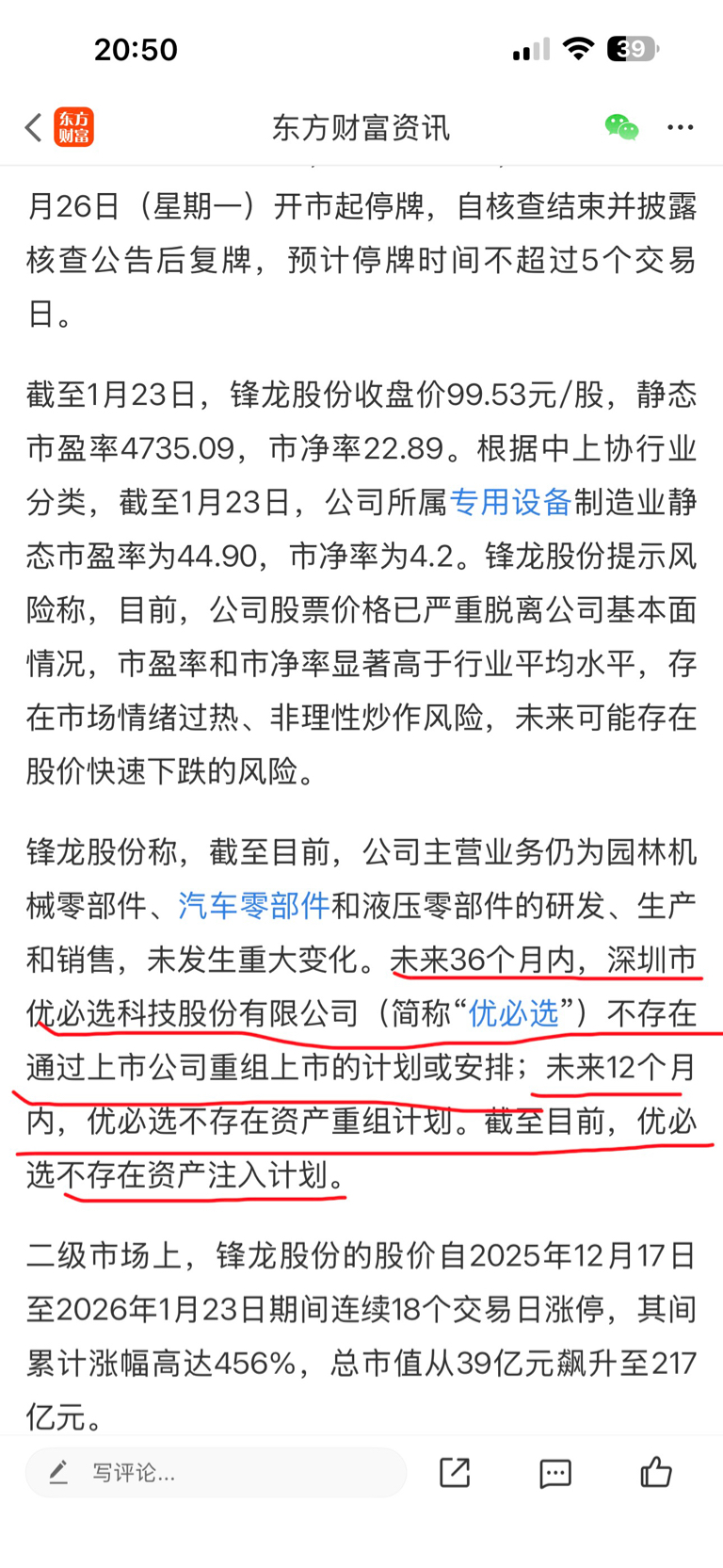 $锋龙股份(SZ002931)$ 停牌是小事,但这个是大事。这让我想起了炒作重组的华建集团在高位发布公告澄清12个月内没重组计划后的走势