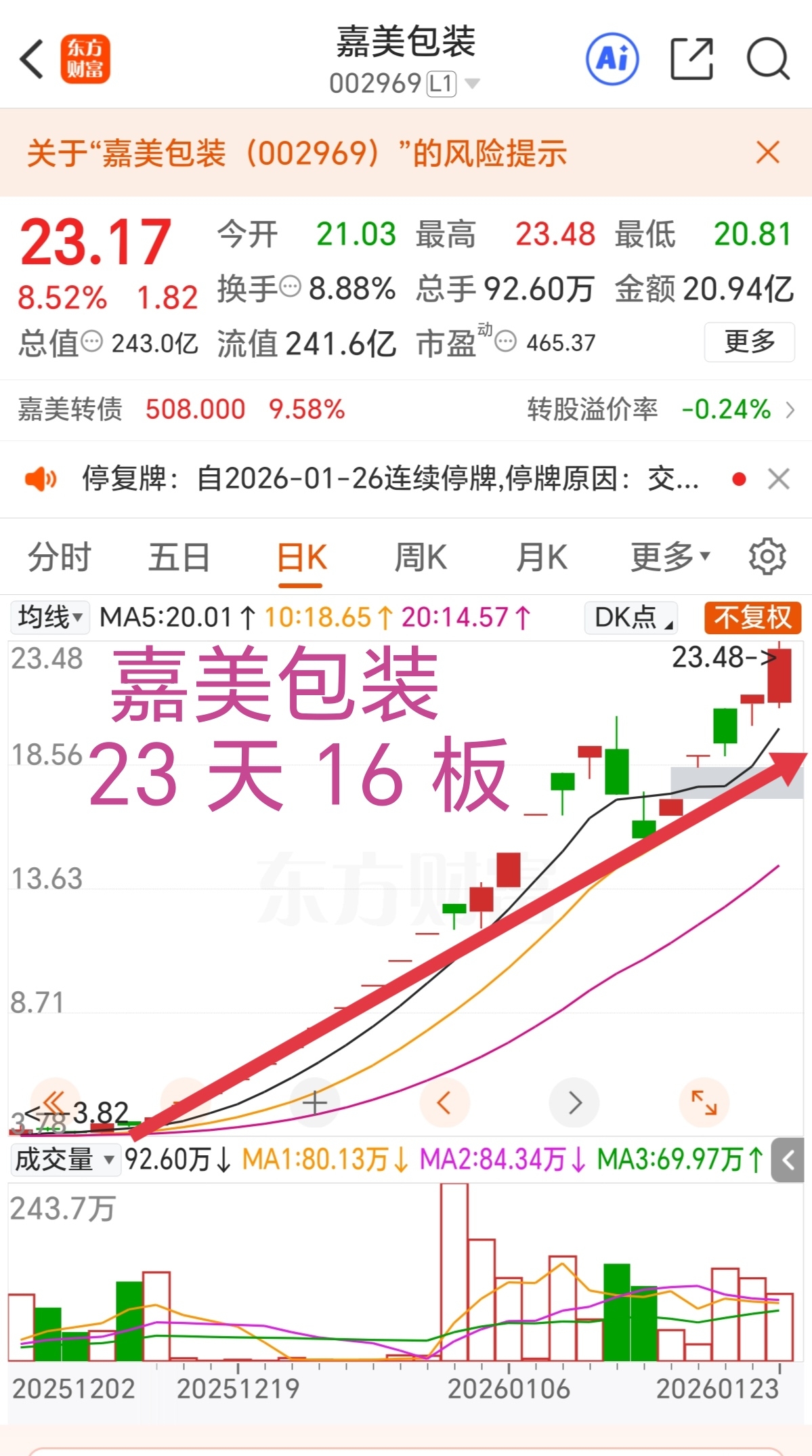 锋龙股份、嘉美包装深夜砸出重磅公告,1月26日起停牌核查,暴涨行情戛然而止!这两只近期A股最火妖股,短短一个多月涨幅超400%,锋龙18连板冲上99.53元,嘉美26个交易日16板创历史新高,资金抱团炒作彻底引爆市场 !