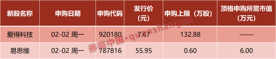 本周(2月2日—2月6日)有3只新股发行,周一:爱得科技、易思维。