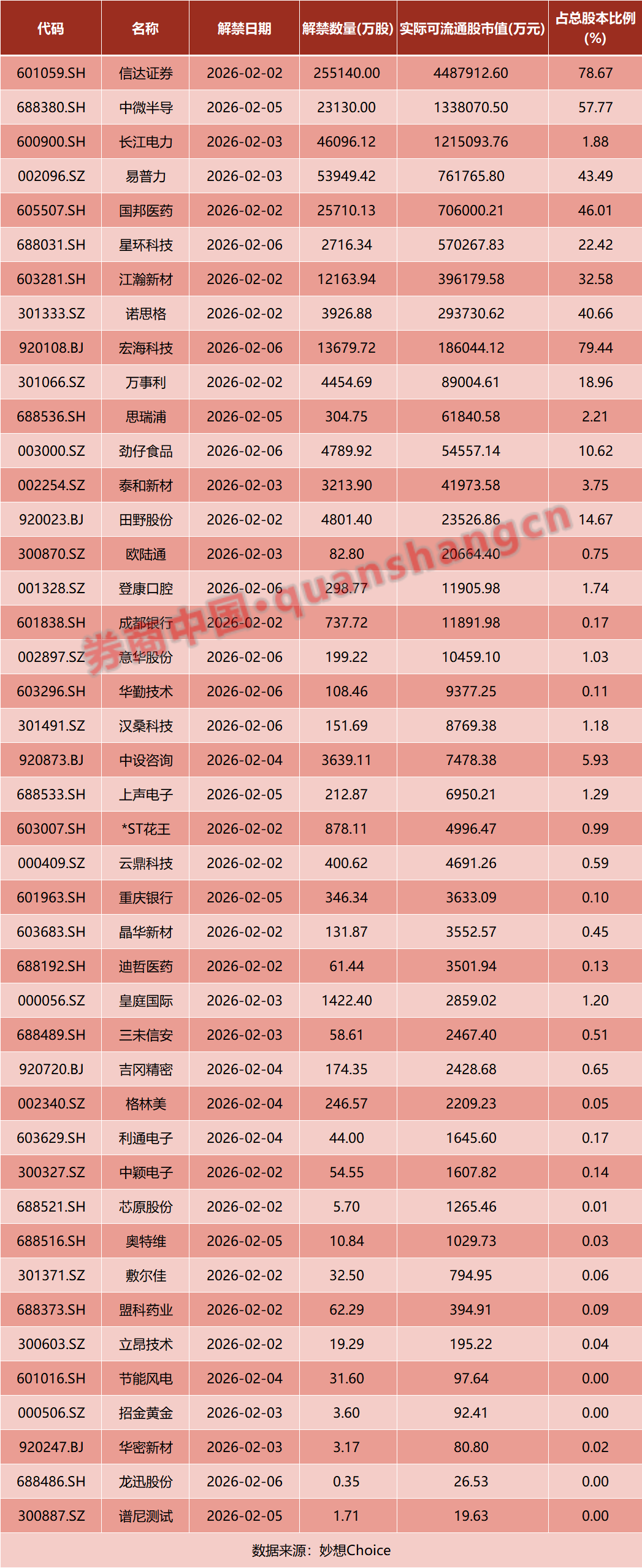 从解禁占比来看,解禁占比居前三位的是:宏海科技(79.44%)、信达证券(78.67%)、中微半导(57.77%)。