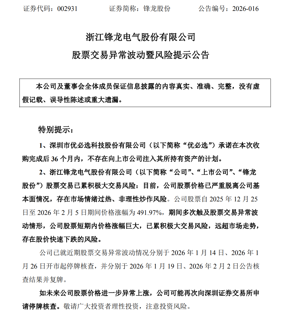2月6日盘前,锋龙股份发布股票交易异常波动暨风险提示公告。锋龙股份称,如未来公司股票价格进一步异常上涨,公司可能再次向深圳证券交易所申请停牌核查。敬请广大投资者理性投资,注意投资风险。
