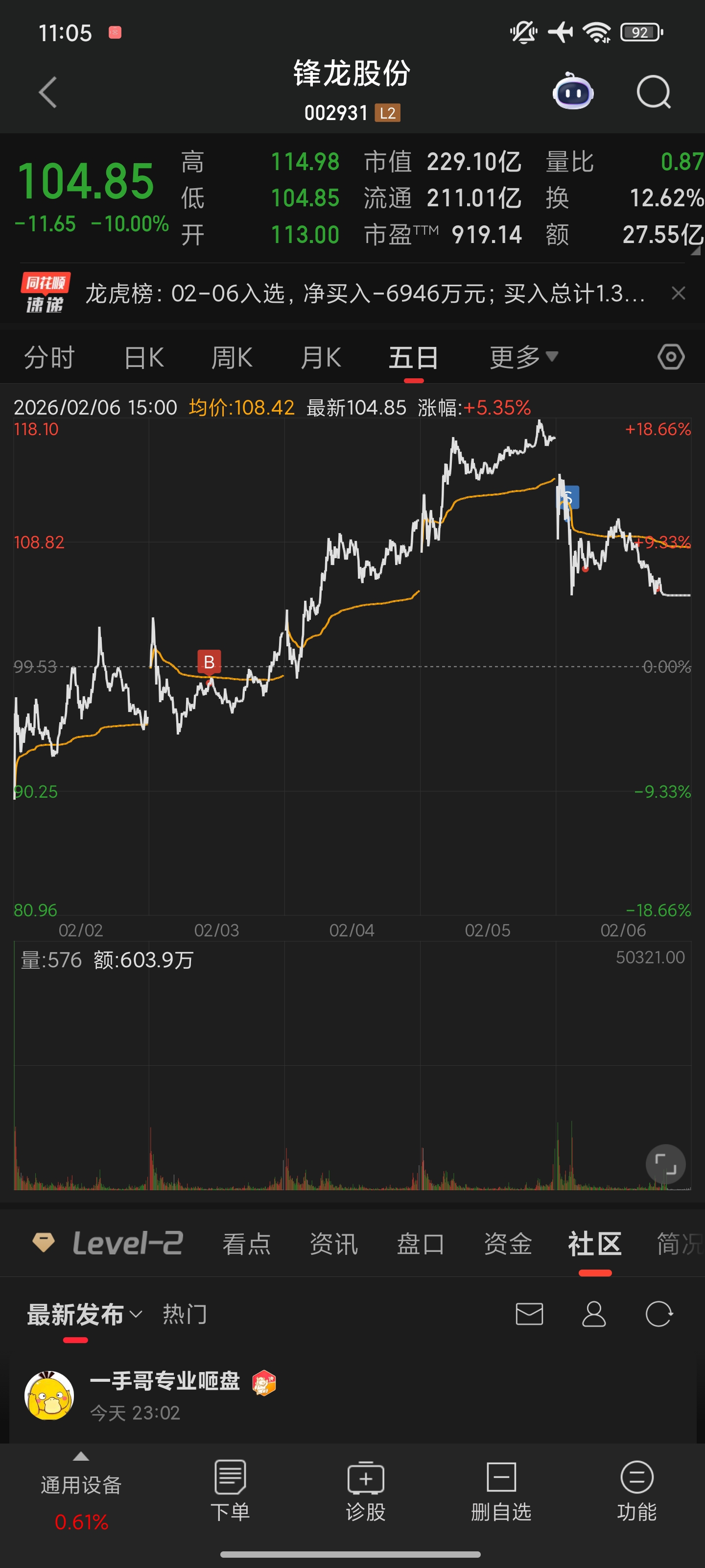 $锋龙股份(SZ002931)$ 周五分时向下t了3个点,要是向上t都不t,羡慕余哥上纬惊艳,如今到了自己可与之前行的时候又怎能心生惧意,我选择信自己也信余哥。94的成本,要么不赚,要么赚个大的。胆识,有胆无识,尚有一半胜算,有识无胆却是毫无胜算,我即徘徊在有胆有识和有胆无识之间,总好过尔等徘徊在有胆无识和无胆无识之间。